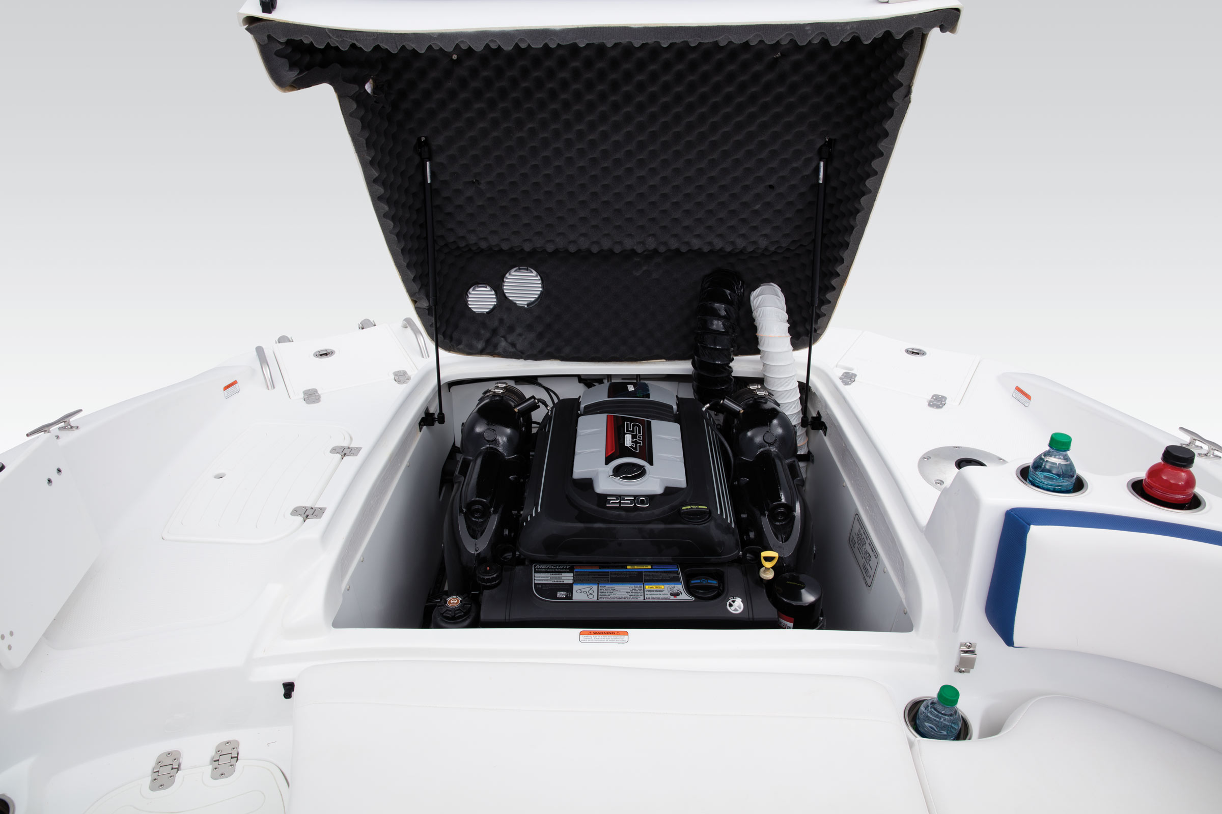 There is little difference from the console forward to the bow in either power option. Where you will notice the difference is toward the stern of the boat.