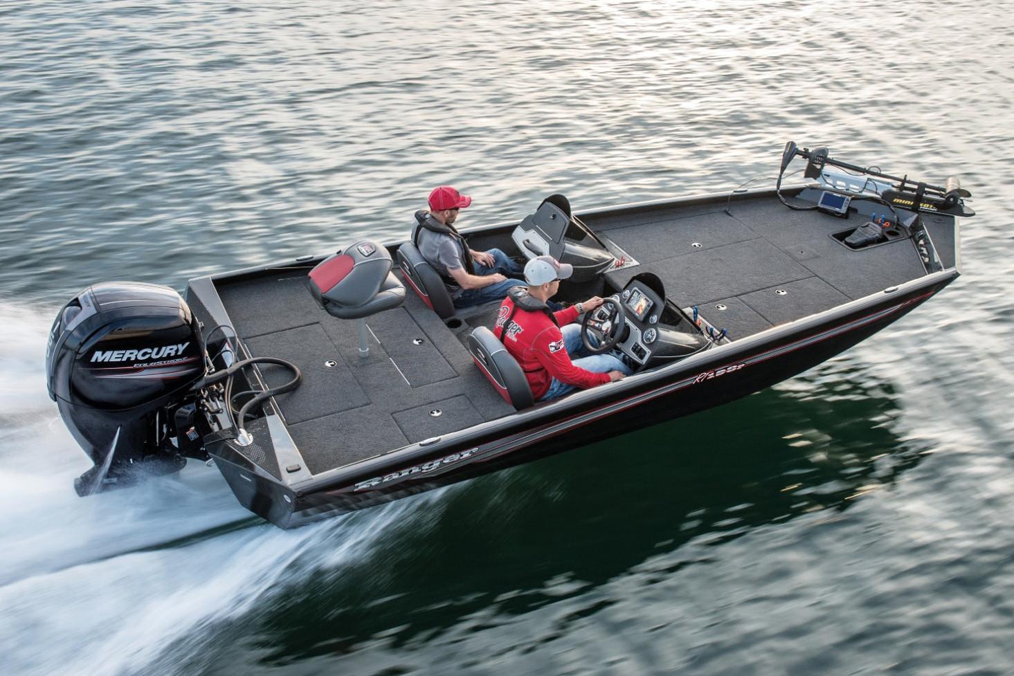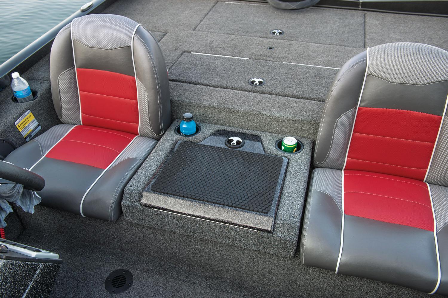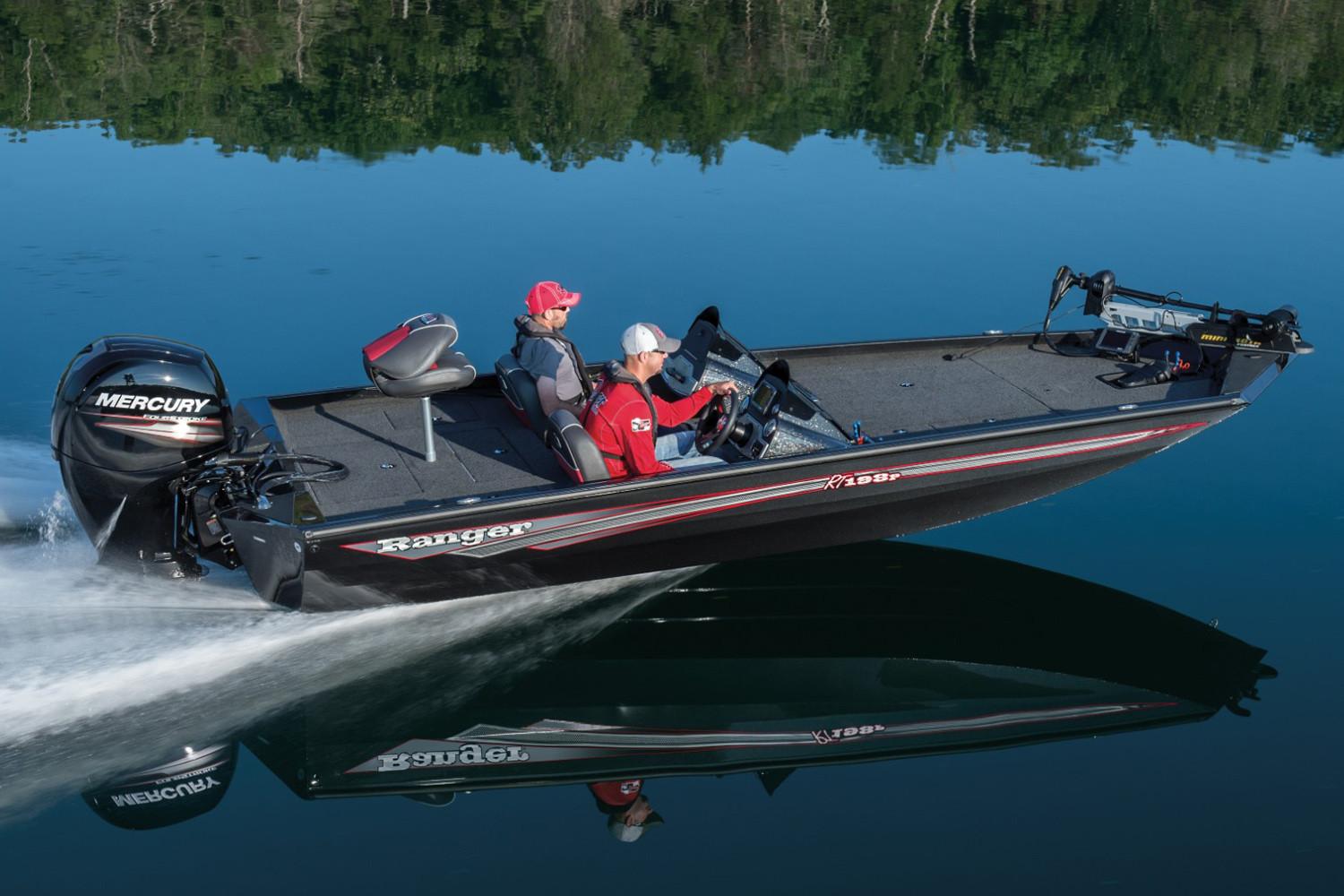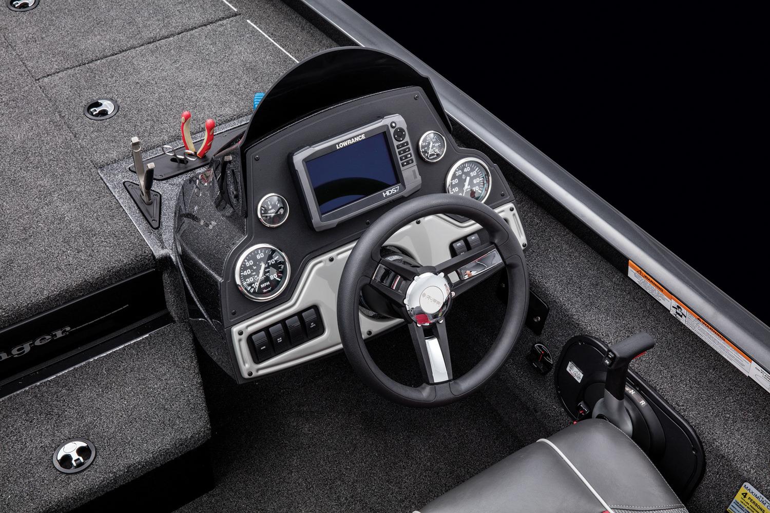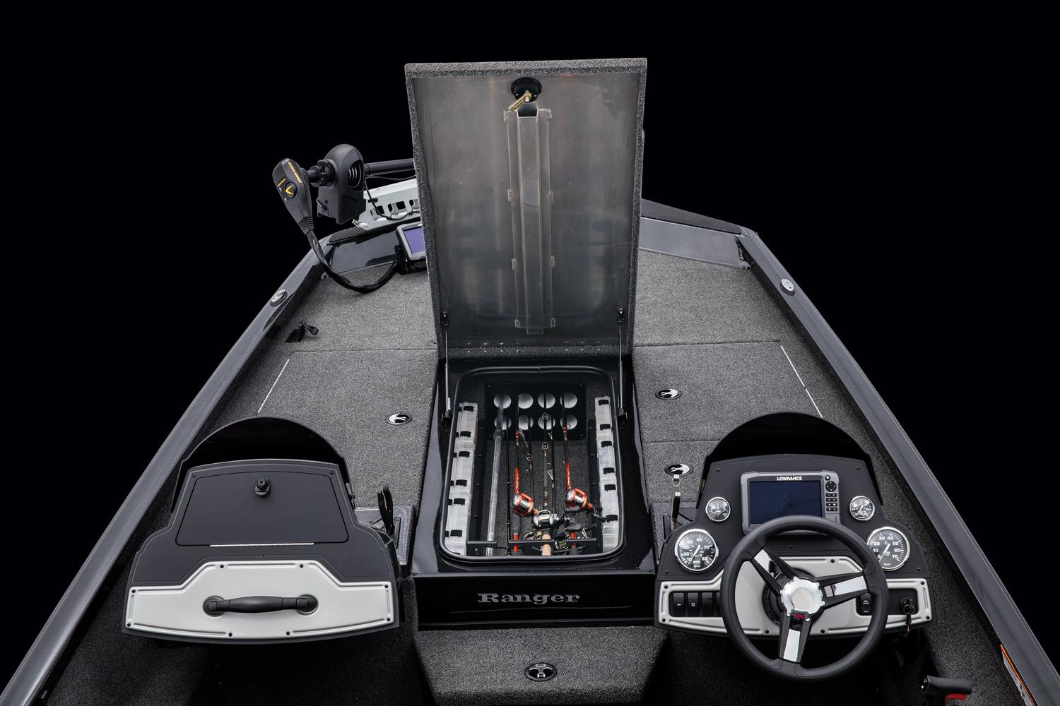 The wide front casting deck is complemented by a retractable rod strap, 8’ center rod storage and an integrated fiberglass cooler. The cockpit is highlighted by premium marine upholstery and a durable fiberglass console featuring flush-mounted Lowrance electronics and multi-function gauges. Moving aft, the spacious rear deck offers even easier access to batteries and pumps, complete with spare prop storage and room for an on-board battery charger. Combined with a custom-fitted Ranger Trail trailer, the Ranger RT198p is ready to take on any tournament trail.