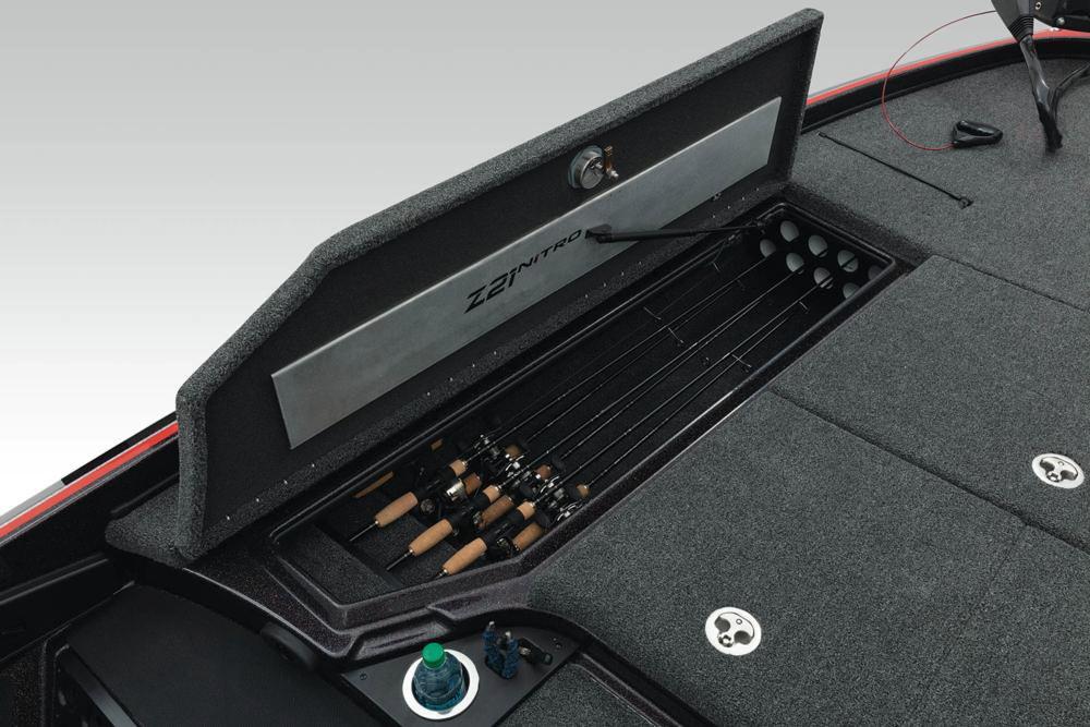 • Oversized, lockable bow port & starboard rod lockers w/lift assists for rods up to 8' (2.44 m)