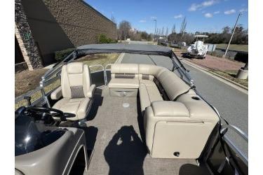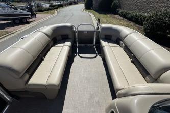 Regardless your crew’s size, this pontoon boat packs the right amount of features for a full day of fun. To start, check out the dual bow couches and midship L-lounge, all with the STOW MORE™ seat storage system to provide plenty of space for gear (the seat-back compartments can even be accessed safely while cruising!). Or, crank up the Bluetooth® stereo and take a cooling dive off the full-width swim platform—there’s even an extra-large ladder for easy reboarding.