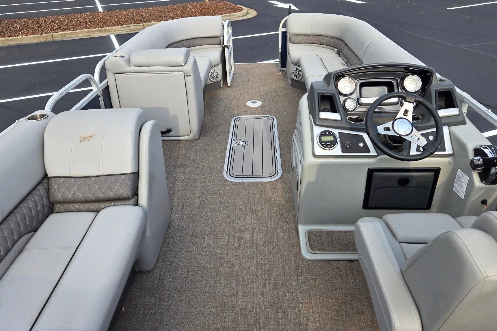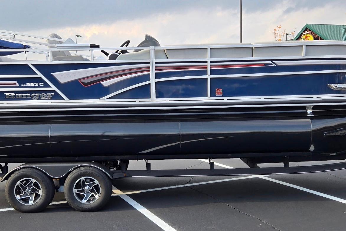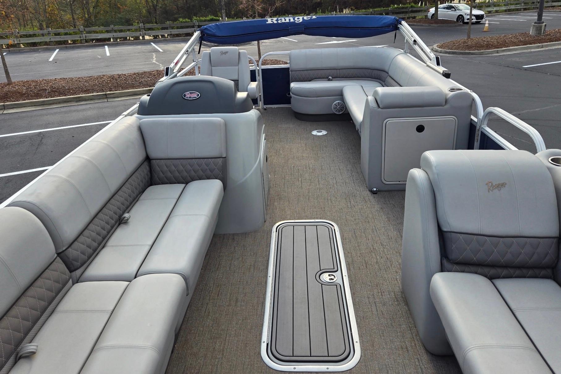 Smooth, solid power, refined luxury and maximum convenience define the Ranger® Reata® 223C. With three powder-coated pontoons, hand-crafted seating and an 11-foot Bimini top, this pontoon is ready to move you in comfort and style. A full-width rear swim platform with boarding ladder are adjacent to the PowerPod™ motor extension that delivers enhanced performance and a quieter ride. Within the redesigned gates is luxury from top to bottom, from the soft-touch woven flooring to the extra-plush lounges and overstuffed captain’s chair. Storage beneath every seat and under the console easily hold a day’s worth of gear while a 200-horsepower rating ramps up excitement on demand. With so much capability, the Ranger 223C delivers high performance, even at 0 MPH.