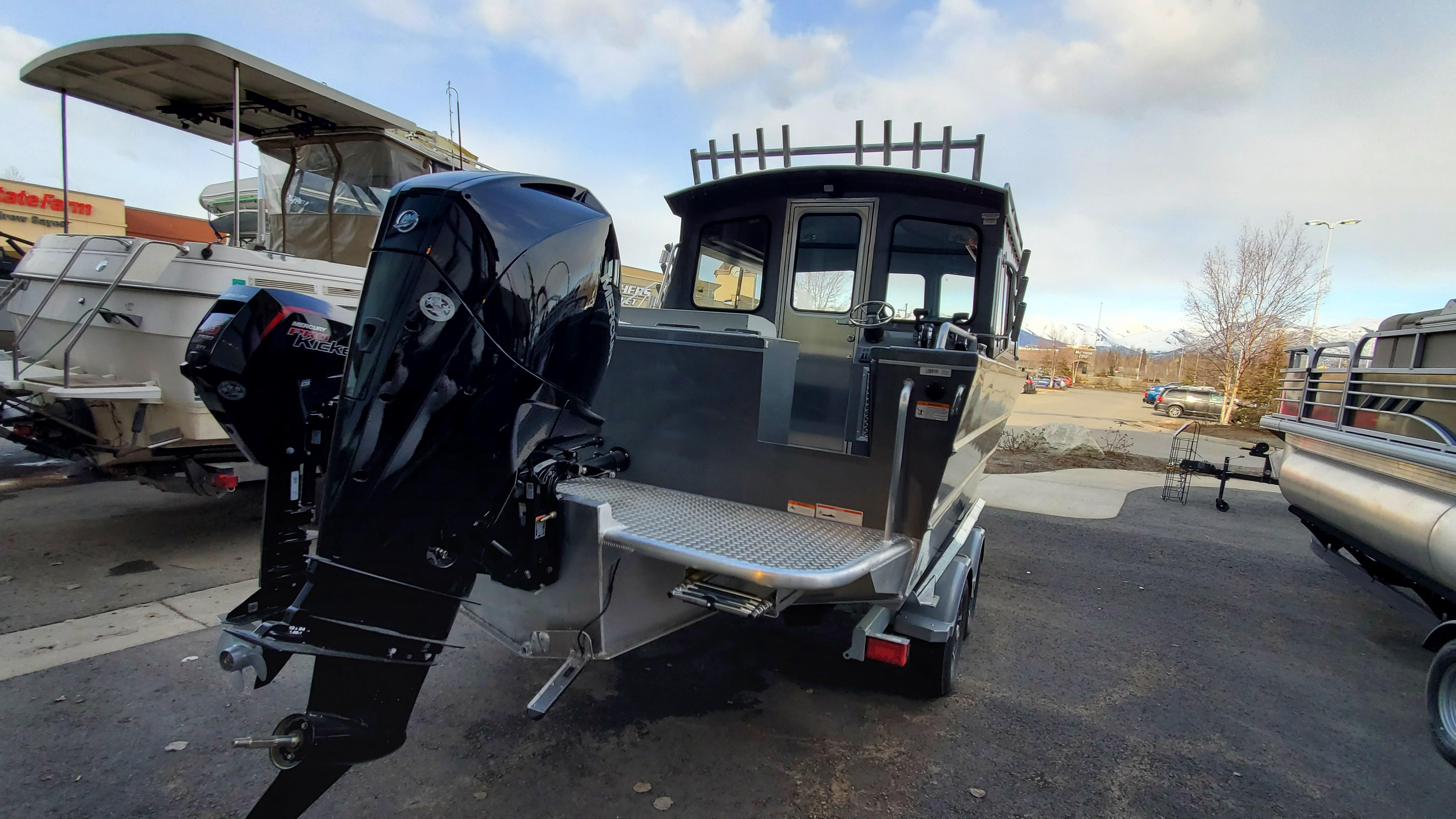 • Alaskan Bulkhead Fishing Pro Package - Mercury Pre-Rig 1 Engine / 2 Station; Side Tray Repositionable Cupholders (4); Forward In-Floor Rod Storage; Insulated Transom Fish Box; Net Holder – Port/Stbd Side; Hardtop Side Mount Rod Holders (3) – Port/Stbd; Wash Down; Dual Bilge Pumps; Dual Battery Set-Up; 2 Bank Automatic Battery Charger; Quick Connect Kicker Fuel Supply; Welded Platform Kicker Bracket; Anchor Roller w/ Jamb Cleat; Kicker Binnacle Mount Ctrl At Aux Station; Aux Steering Station; Roof Mounted Rod Rack (10)