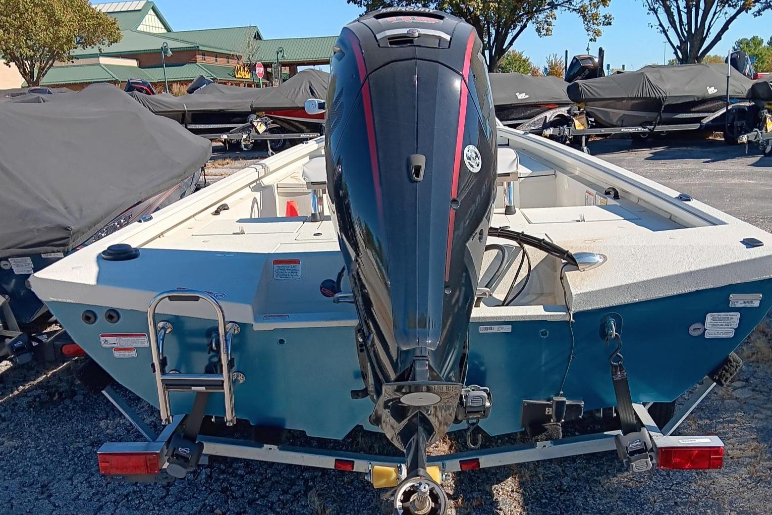 Built for bayous, bays and backwaters, the Ranger® RB190 is a shallow-drafting workhorse that’s ready to take on inshore species with saltwater-savvy touches from the all-aluminum trailer to the grippy, easy-to-clean Rawhide™ interior coating and pad-bottom hull for a smooth ride and responsive handling. Dual rear jump seats add deck space when down or seating when up and a padded driver’s leaning post flips down to expose a livewell that’ll accommodate tournament-size reds. The wide, stable and shallow-drafting design complements the 115-horsepower rating and slices through chop with nimble and economical performance. BayStar® hydraulic steering and a binnacle-mount throttle on the fiberglass console keep you confidently in command. Huge gear storages, twin 8-foot rod boxes and integrated cup and tool holders accentuate the angler-friendly layout and make days on the water easy in this lake, bay and backwater master.