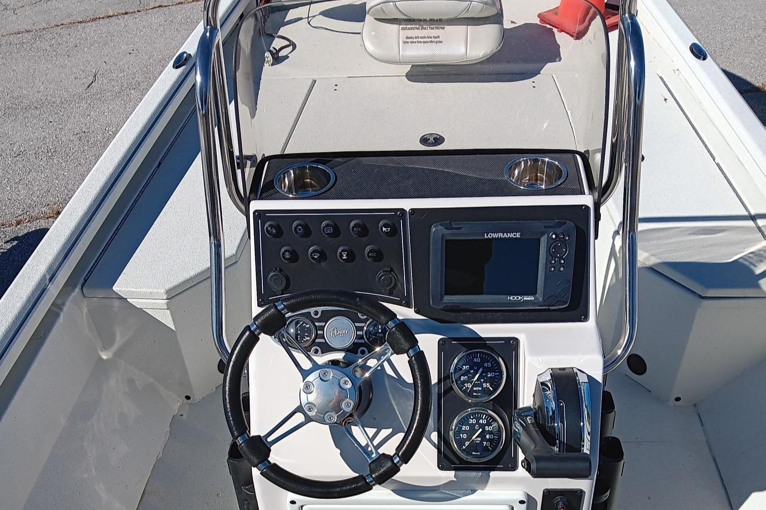 Included Options - Custom Boat Cover, Trailer Brakes, Minn Kota Riptide Maxxum 80lb Hand Control T/M, Lowrance Hook 7 Reveal @ Console