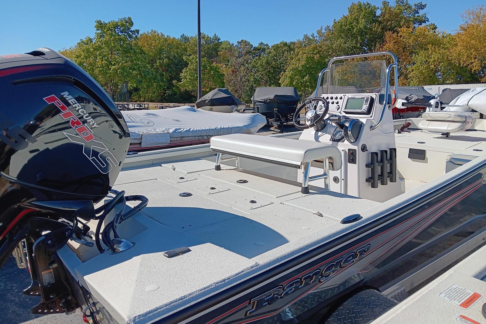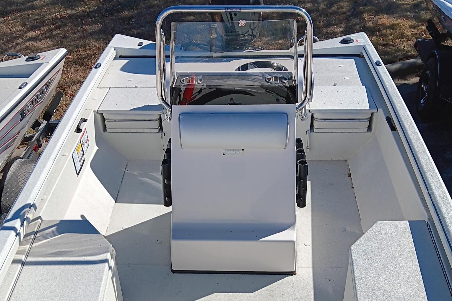 Built for bayous, bays and backwaters, the Ranger® RB190 is a shallow-drafting workhorse that’s ready to take on inshore species with saltwater-savvy touches from the all-aluminum trailer to the grippy, easy-to-clean Rawhide™ interior coating and pad-bottom hull for a smooth ride and responsive handling. Dual rear jump seats add deck space when down or seating when up and a padded driver’s leaning post flips down to expose a livewell that’ll accommodate tournament-size reds. The wide, stable and shallow-drafting design complements the 115-horsepower rating and slices through chop with nimble and economical performance. BayStar® hydraulic steering and a binnacle-mount throttle on the fiberglass console keep you confidently in command. Huge gear storages, twin 8-foot rod boxes and integrated cup and tool holders accentuate the angler-friendly layout and make days on the water easy in this lake, bay and backwater master.
