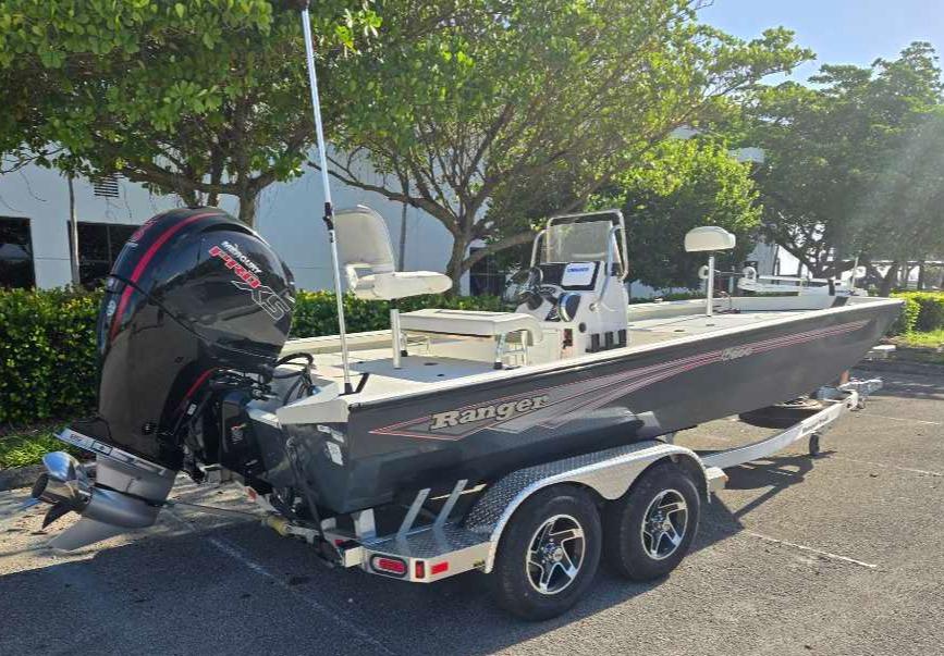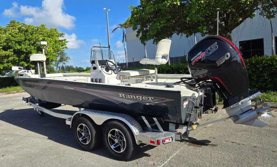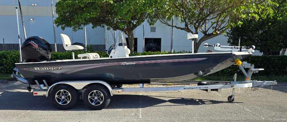 The RB200 packs more muscle in a bigger hull for greater performance, stability and capability to take you further than ever. The pad-bottom hull is designed for a dry ride that planes in a hurry, even in the shallows. The all-welded hull delivers strength in chop while precision steering and throttle control give you the ultimate in command. The wide, stable front casting deck delivers huge room for multiple anglers, and the interior is perfectly tailored for taking on inshore fisheries or a bass tournament with dual livewells and rod boxes, a huge in-deck storage and storage under the rear jump seats. At the helm, electronics up to 9" may be flush mounted and membrane-style switching delivers convenient simplicity. The ruggedized Ranger Trail® trailer is constructed with all-welded aluminum for the utmost in corrosion-resistant strength. Diamond plate fenders offer a step up and protection from road debris. A new camo version is more than just a paint scheme, this special rig features blacked-out badging, matte black closures and console railing, along with an all-black steering wheel for maximum concealment. No matter where your quarry swims, the enhanced capability of the RB200 is designed to Dominate Inshore and Nearshore.
