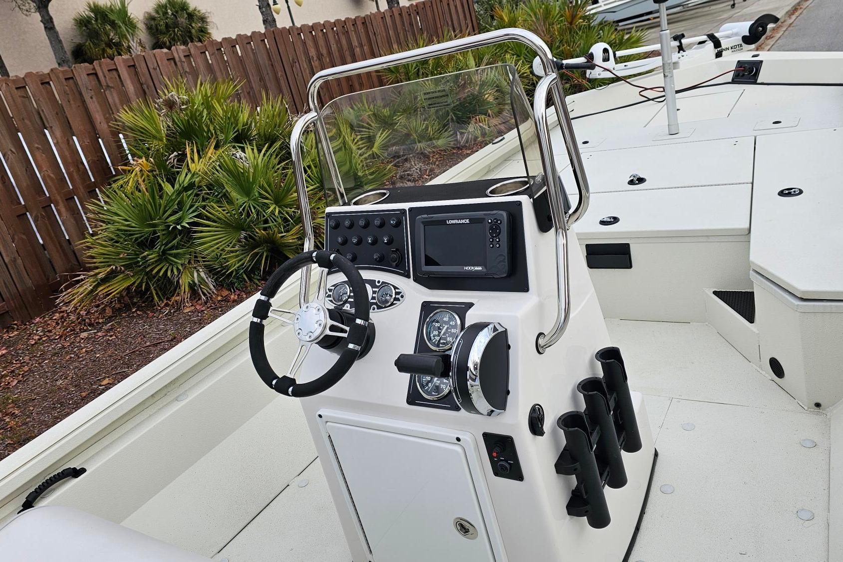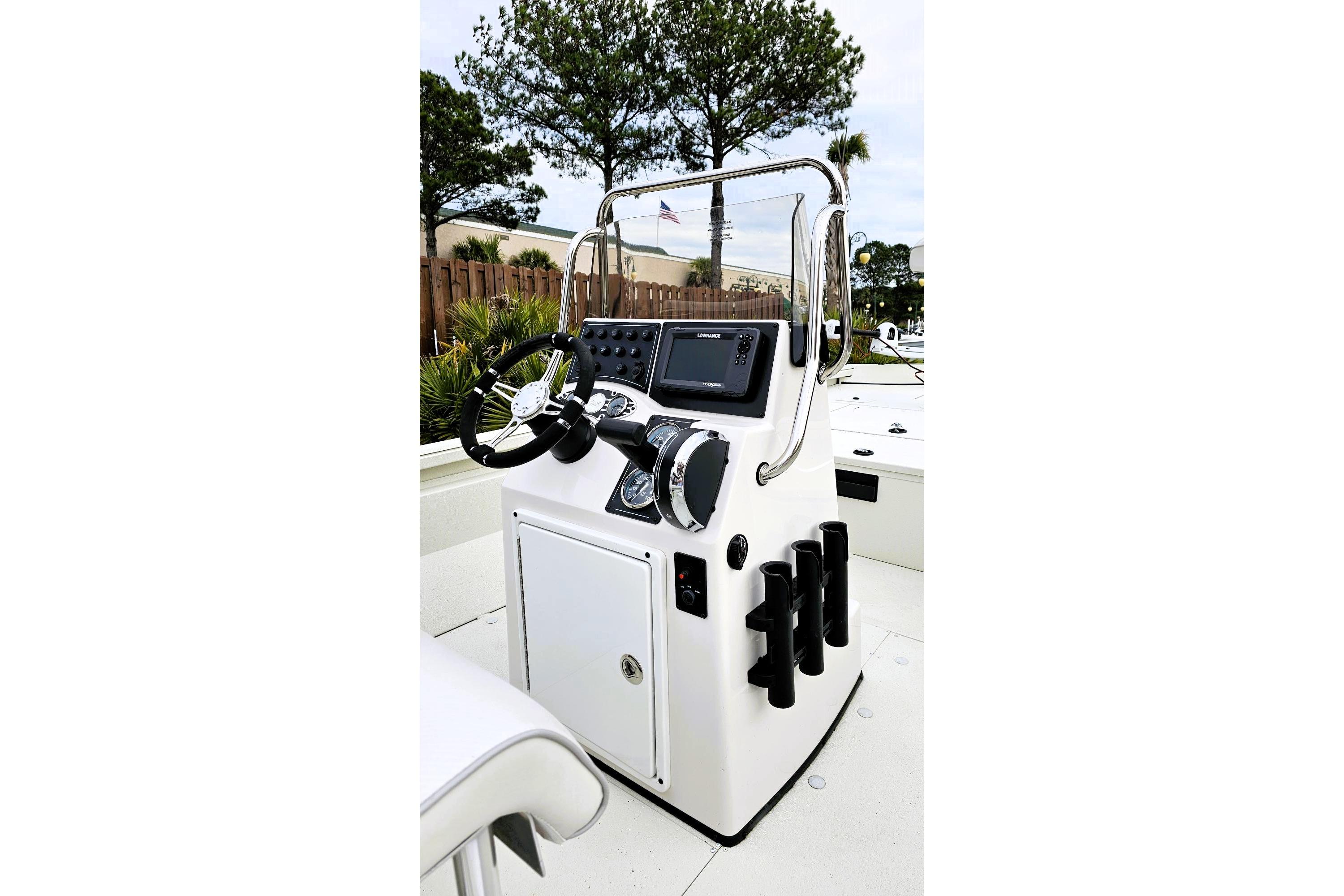 • Custom fiberglass console w/ tach, speed, fuel, trim gauges & easy touch switching