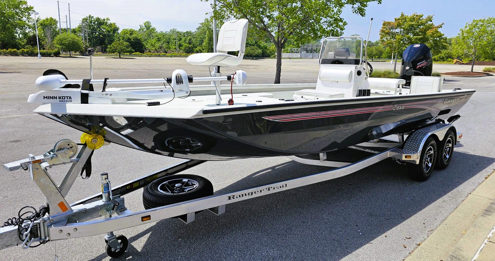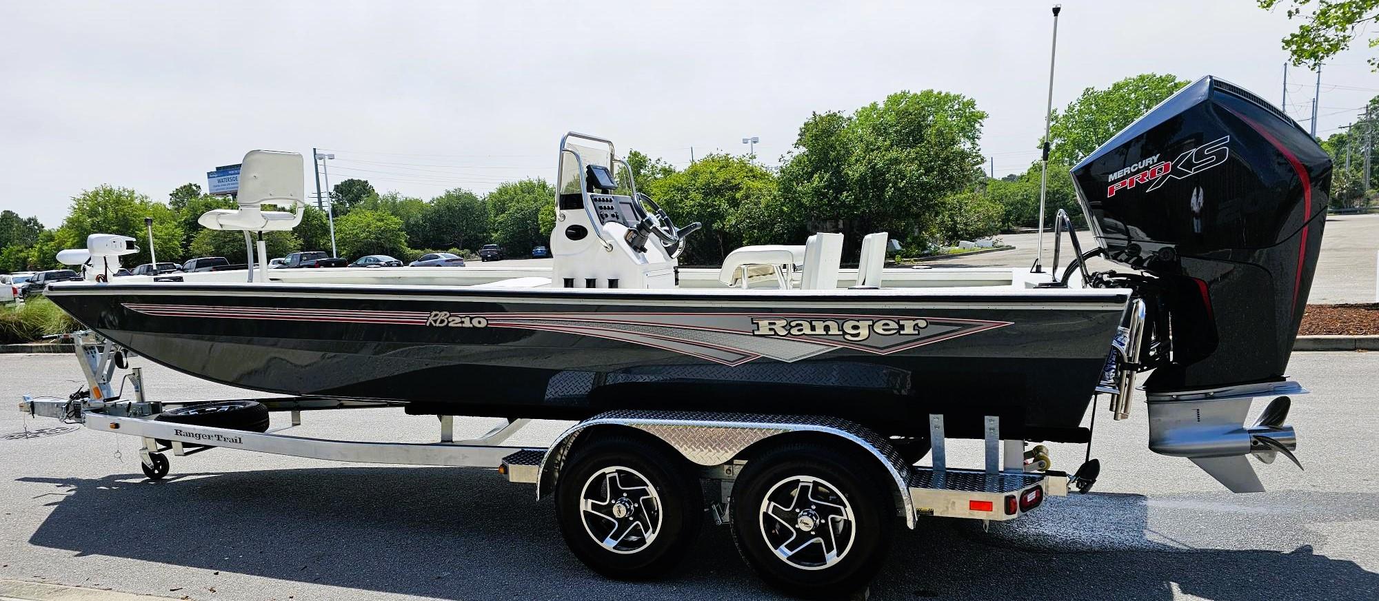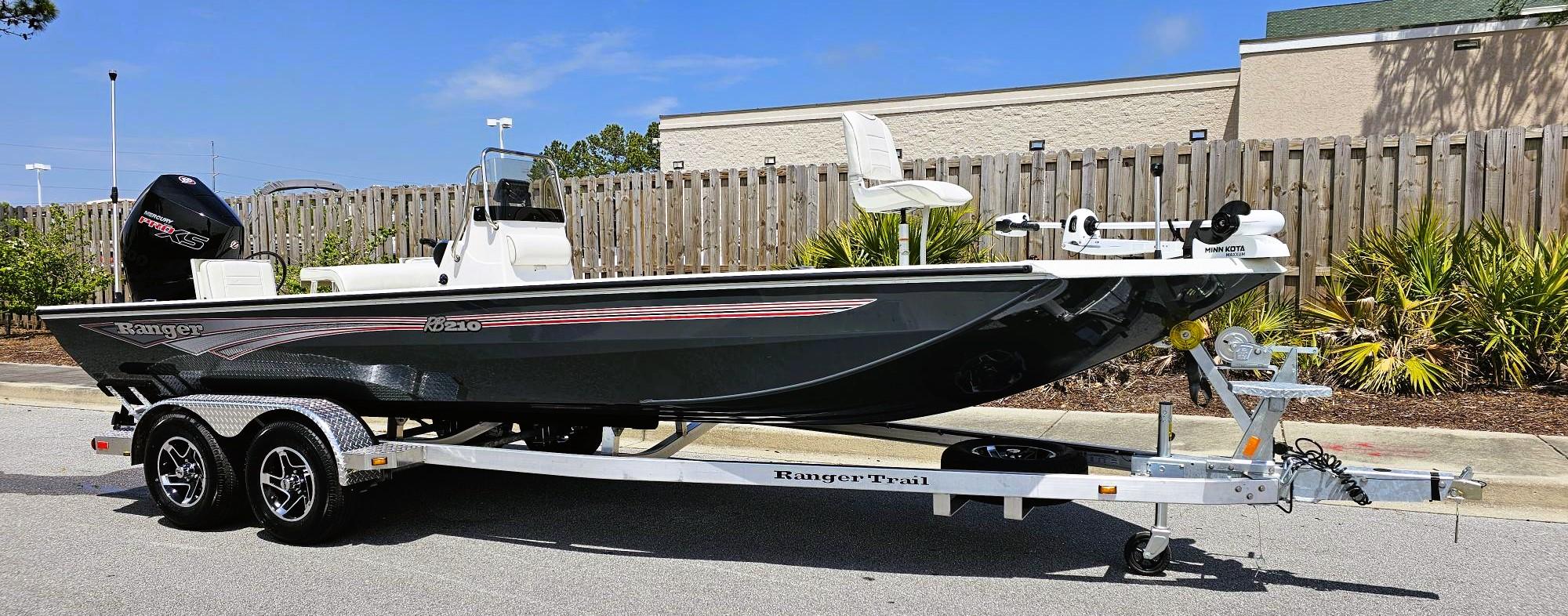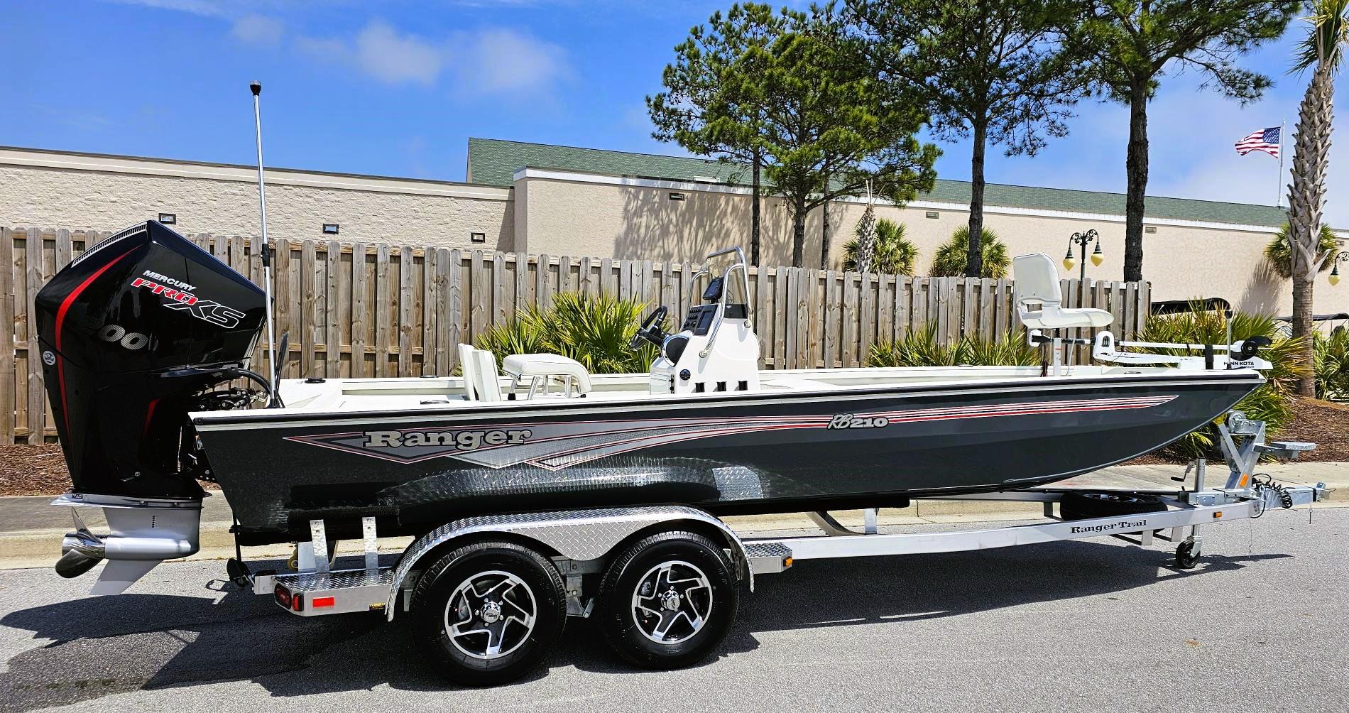 The all-new RB210 packs more muscle in a bigger hull for greater performance, stability and capability to take you further than ever. The pad-bottom hull is designed for a dry ride that planes in a hurry, even in the shallows. The all-welded hull delivers strength in chop while precision steering and throttle control give you the ultimate in command. The wide, stable front casting deck delivers huge room for multiple anglers, and the interior is perfectly tailored for taking on inshore fisheries or a bass tournament with dual livewells and rod boxes, a huge in-deck storage and storage under the rear jump seats. At the helm, electronics up to 9" may be flush mounted and membrane-style switching delivers convenient simplicity. The ruggedized Ranger Trail® trailer is constructed with all-welded aluminum for the utmost in corrosion-resistant strength. Diamond plate fenders offer a step up and protection from road debris. A new camo version is more than just a paint scheme, this special rig features blacked-out badging, matte black closures and console railing, along with an all-black steering wheel for maximum concealment. No matter where your quarry swims, the enhanced capability of the RB210 is designed to Dominate Inshore and Nearshore.