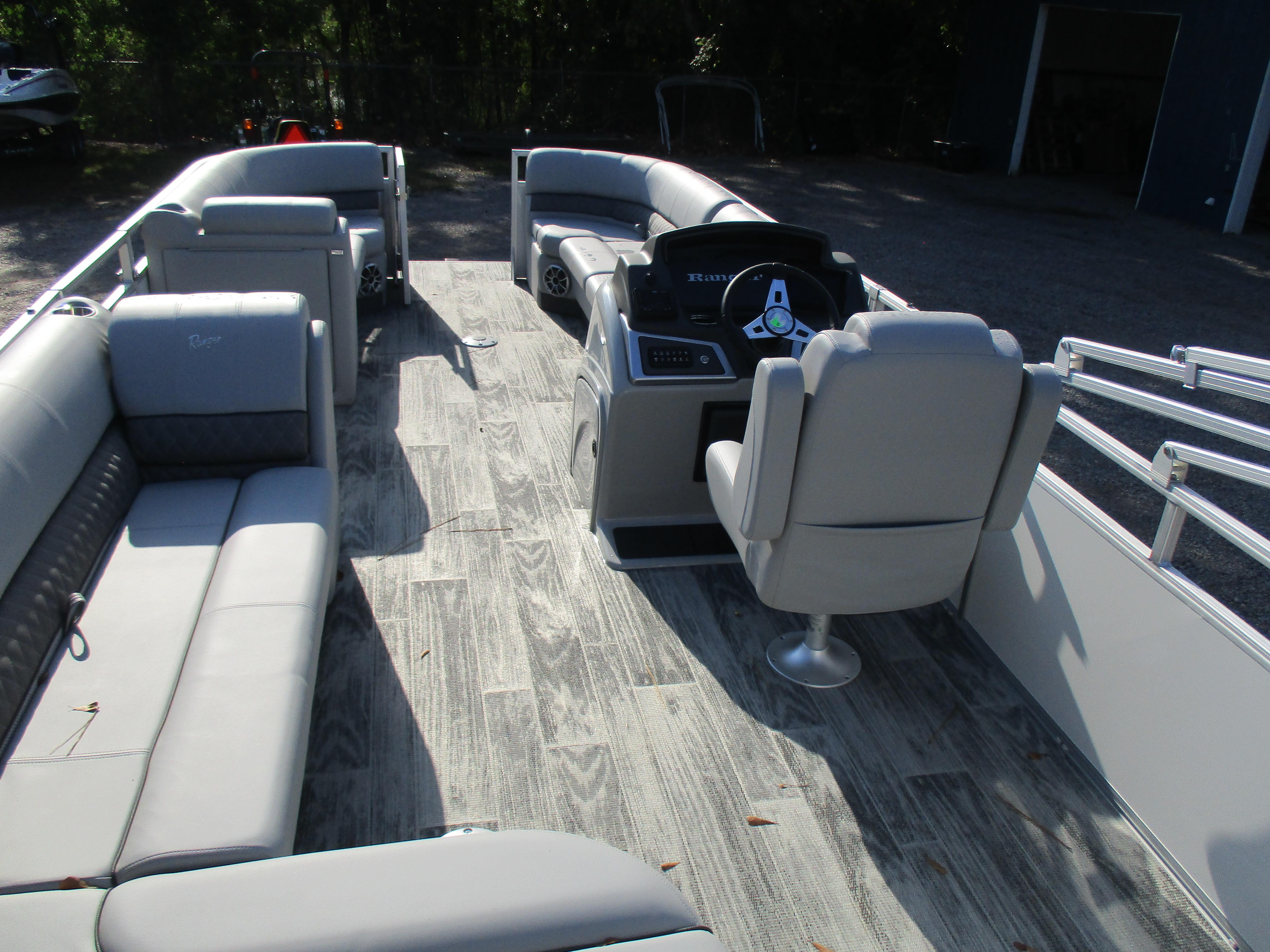With a deck big enough for any undertaking, the Ranger® Reata® 220C is an easy-to-maneuver platform that gives up nothing in capacity while boasting a full complement of high-end touches inside and out. Chrome bezels surround LED navigation and docking lights on the redesigned fencing.  Gates equipped with stainless steel hardware provide entry to the plush deck, highlighted by an updated helm seat and fully featured console complete with no-feedback steering and an array of gauges.  A Dowco EasyLift™ 10-foot Bimini top keeps things cool while a wealth of cupholders and an under-console cooler storage keep drinks close at hand. When you need to escape into the outdoors, the 220C deliver all kinds of capability for any and everything.