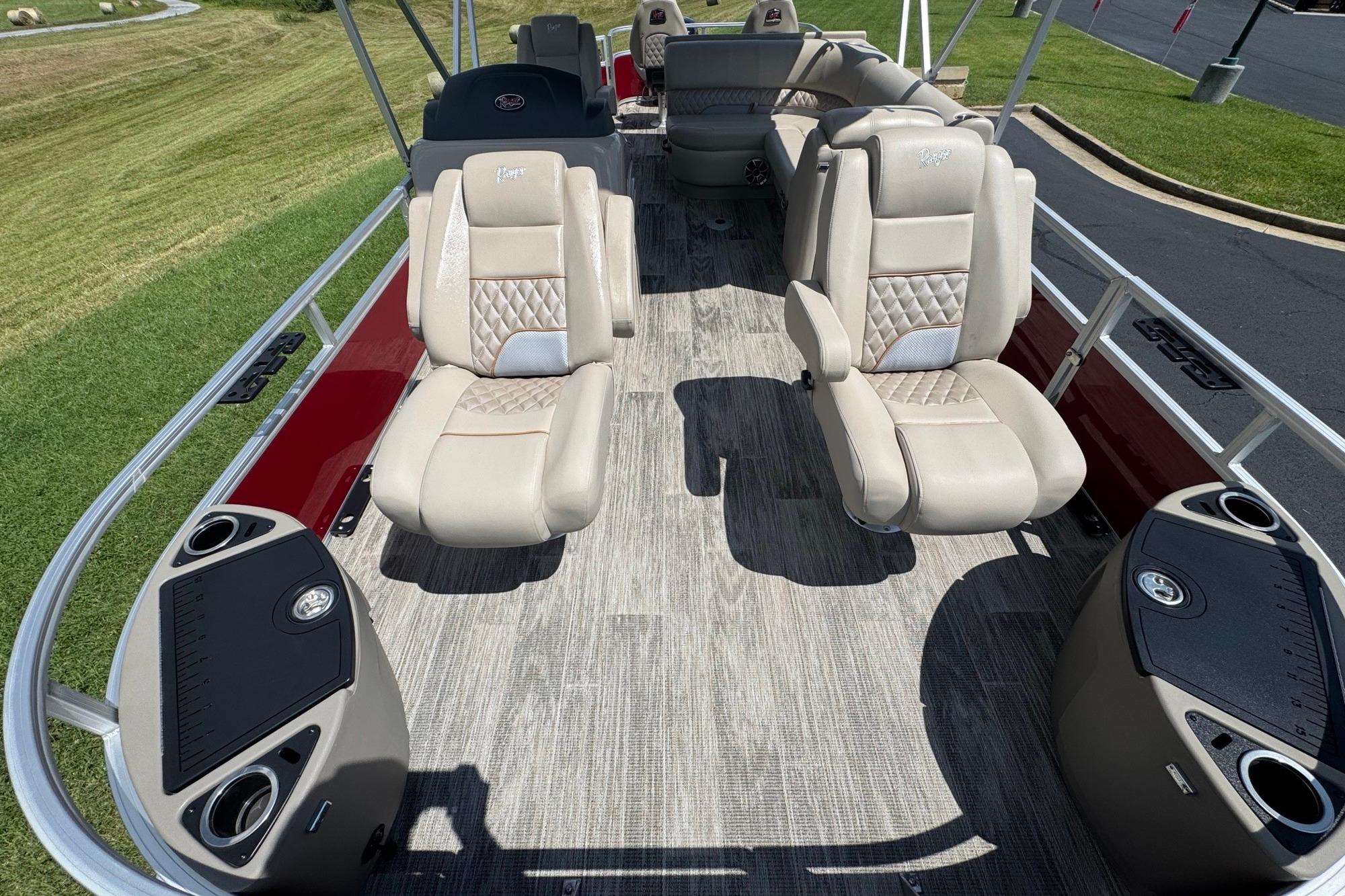 • 2 fore deluxe adjustable, swiveling & reclining fishing chairs w/ self-leveling arms & storage pouch & 2 aft fold-down, swiveling fishing chairs