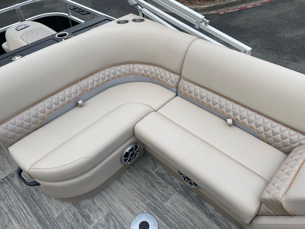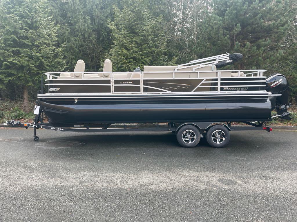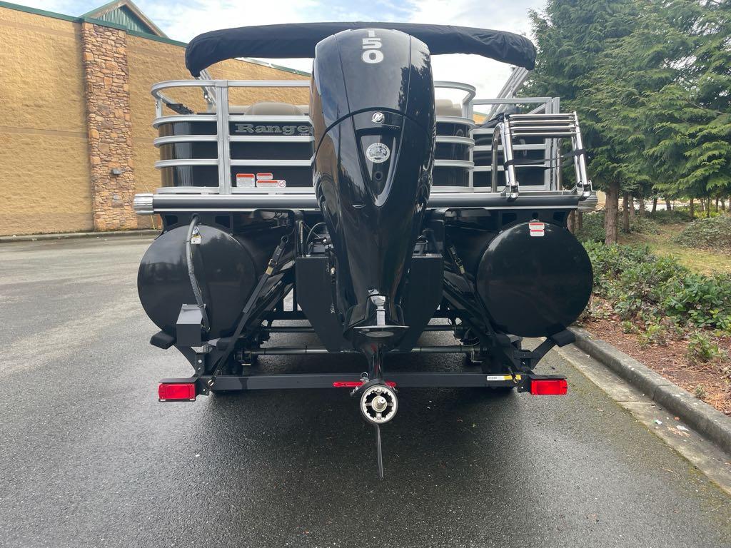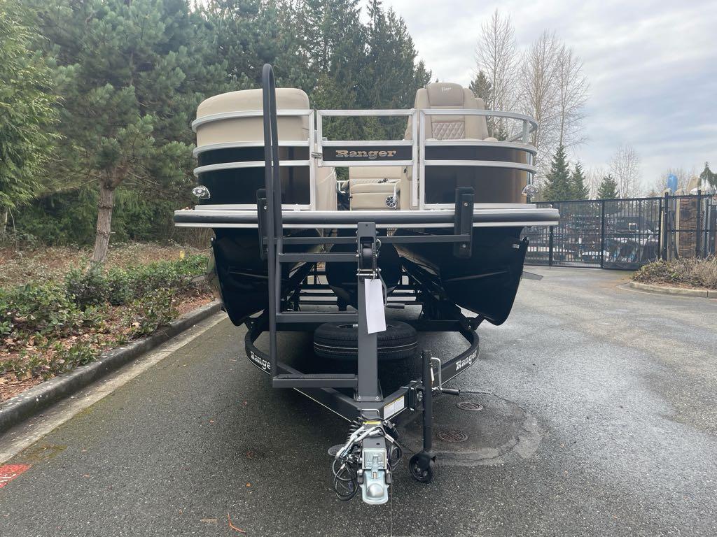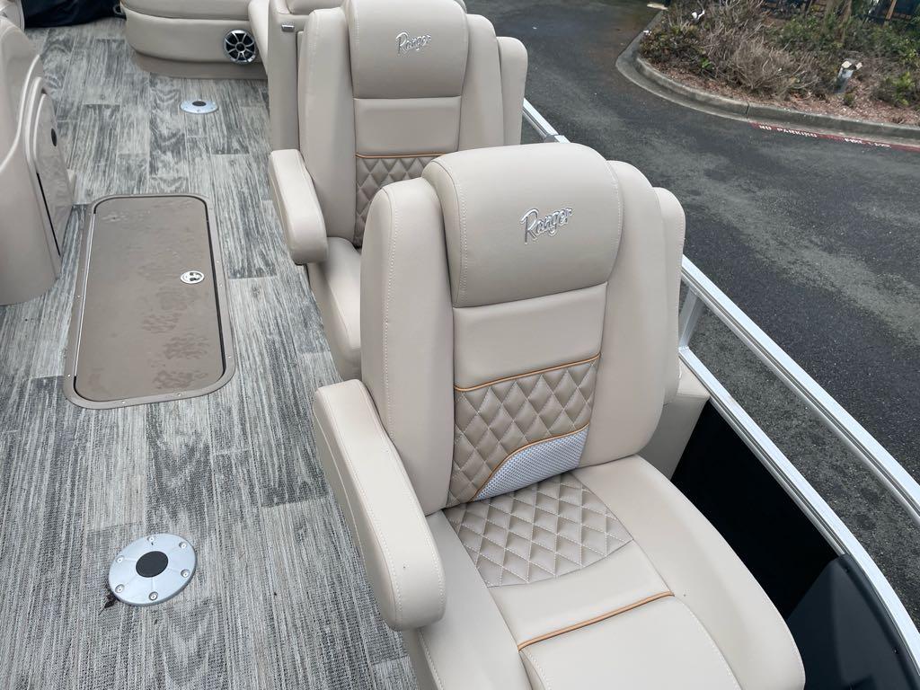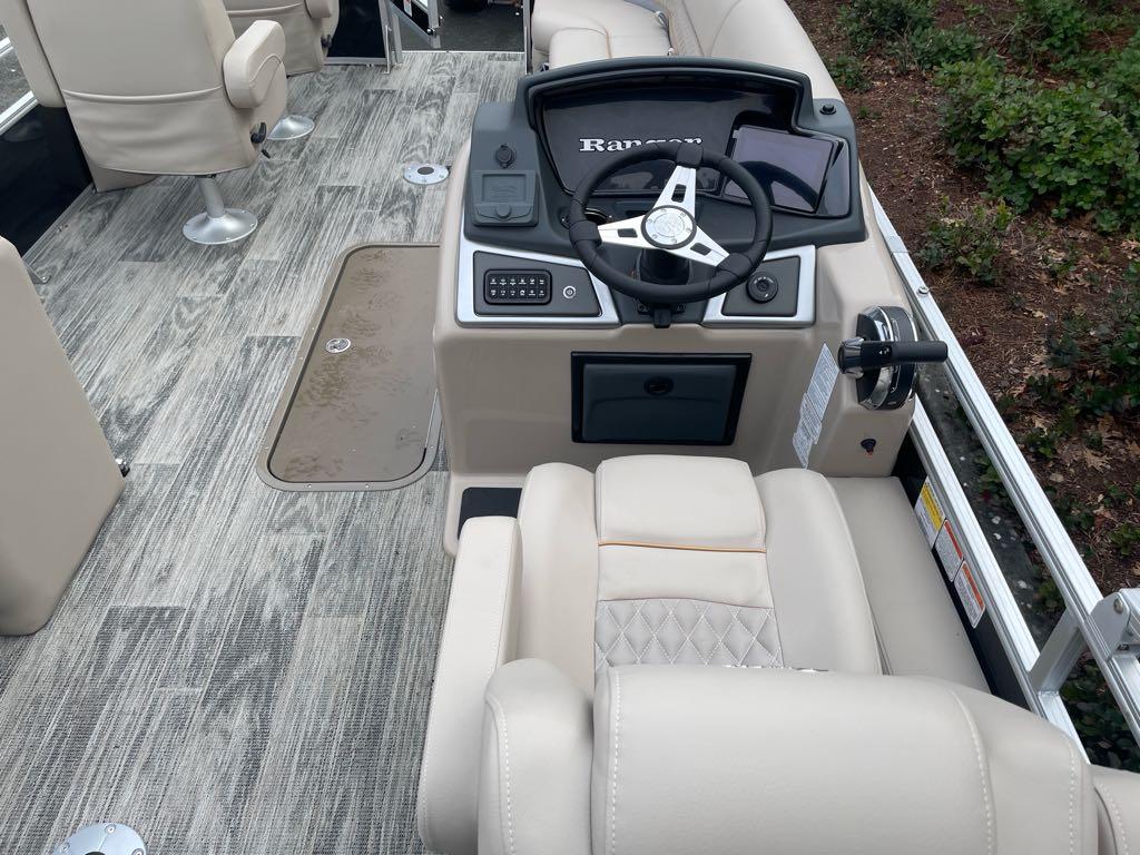 Electrical 500 GPH (1,893 LPH) aerator pump LED navigation lights & built-in docking lights LED courtesy lighting throughout Motor kill switch w/ lanyard Phone management system w/ power outlets Sealed wiring connectors Wiring encased in conduit to prevent chafing Conveniently located 12V & USB outlets   Fishing 2 aft fold-down, swiveling fishing chairs Aft fishing station w/ livewell, tool & gear storage Aft 15 gal. (56.78 L) timed aerated livewell 7' 6" (2.29 m) starboard lockable rod box w/ organizer Pre-wired for easy installation of optional trolling motor and trolling motor front gate   Craftsmanship ABYC® approved 26" (66.04 cm) diameter, .100 pontoon logs w/ individual chambers & internal supports 3/4" (1.91 cm) pressure-treated deck w/ every panel mechanically fastened to Z-bars All-aluminum, box beam transom Full-width extruded Z-bar deck support hidden fastener system Heavy-duty reinforced deck trim Fire extinguisher & horn Heavy-duty, 1-piece extruded M-bracket deck support throughout Multi-density furniture foam for maximum comfort Premium marine upholstery Stainless steel & coated carbon steel fasteners Ranger® 10-Year Lifetime Limited Structural Warranty   Exterior NEW - Updated, modern graphics .032"-thick high-sheen fence panels Available colors: charcoal metallic, black metallic, Ranger blue, pearl white, or matador red Bold exterior styling combining dimensional chrome graphics & externally-mounted anodized railings Noise-dampening fence insulation Stylish deck trim w/ rub rail & highly polished aft corner castings 1-1/4" (3.2 cm) railing w/ mooring cover mounting track 4-step, fold-down, telescoping stainless steel boarding ladder w/ two tall handrails Snapless, trailerable mooring cover w/ removable bow extension for full coverage at home, in the slip or on the road Elevated fencing for better drainage & ventilation 4 Fold-down stainless steel cleats Front porch area Aft boarding platform Mount for optional ski pylon Port wheelchair-accessible gate   Helm NEW - Ranger® RIDE System (Ranger Intelligent Display Engine) touch screen digital dash and 12-button switch panel Adjustable, swiveling & reclining helm chair w/ self-leveling arms & storage pouch Built-in footrest Recessed storage area Enclosed in-console cooler compartment w/ door-mounted molded storage Ergonomically-located throttle & steering wheel Tilt steering wheel Fire extinguisher Horn NEW - Wet Sounds® stereo w/Bluetooth & 4 upholstery speakers Molded shroud w/ soft-touch finish Automotive-style fuse panel   Interior Aft bench-style lounge w/ roto-molded livewell & storage Extra deep rain channels on all molded couch bases for drier storage NEW - 10' (3.05 m) Dowco® EasyLift™ Bimini top w/LED courtesy lights, storage pockets & protective boot NEW - Luxury woven cushioned floor Midship L-lounge w/ roto-molded, drained storage Plush starboard bow lounge and two port side reclining chairs w/ self-leveling arms Stowable table w/ molded-in drink holders   Performance 3 powder-coated pontoon logs w/lifting strakes Aluminum deck undercladding Factory-rigged Mercury® outboard motors Performance-enhancing extended motor pod Factory-matched propeller