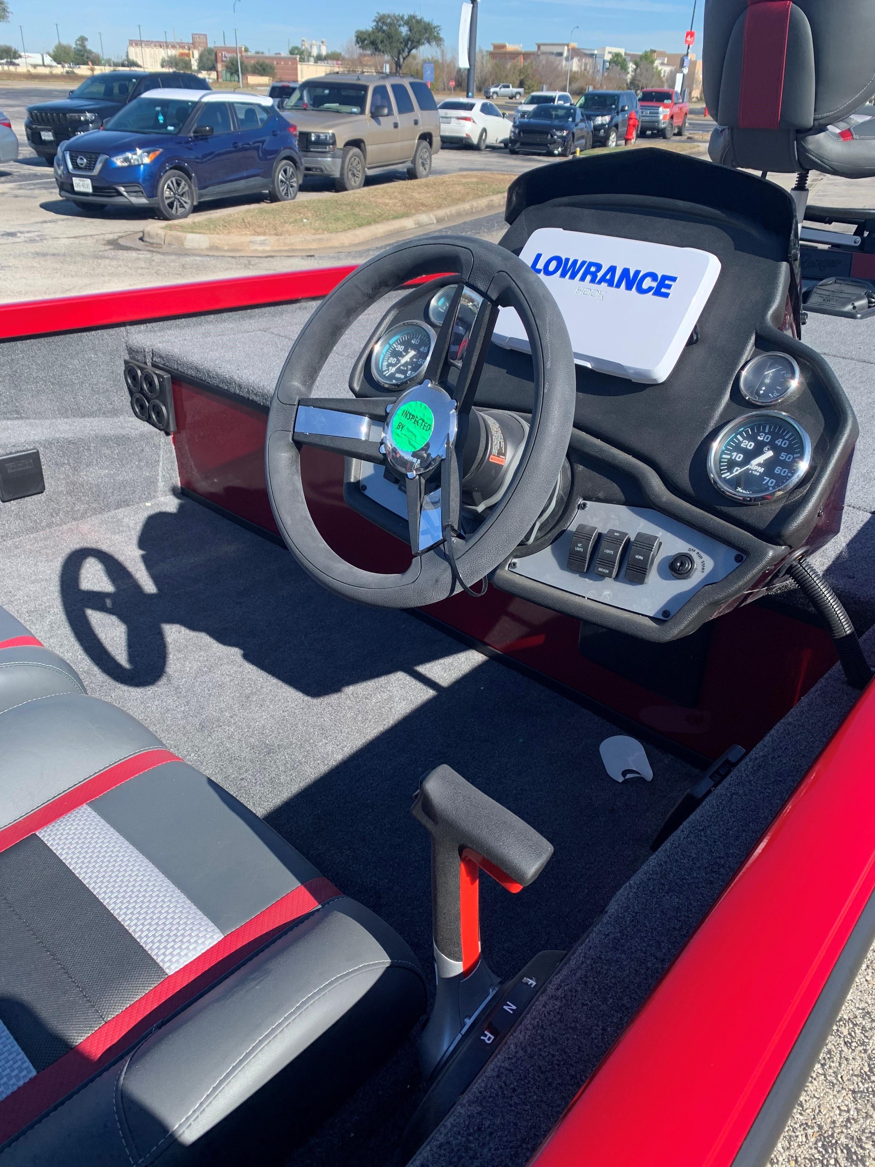 • Custom fiberglass console w/ flush-mounted depthfinder, tach, speed, fuel, trim gauge & easy touch switching