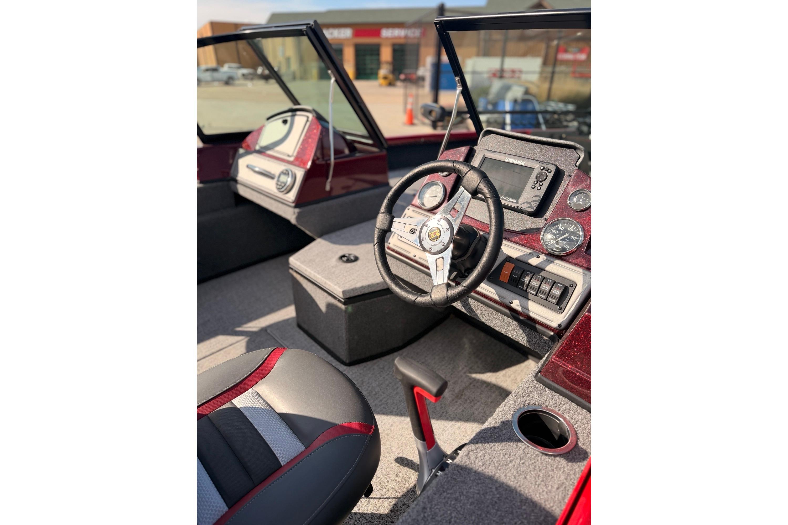 • Custom fiberglass console w/ flush mounted depthfinder, tach, speed, fuel, trim gauges & easy touch switching