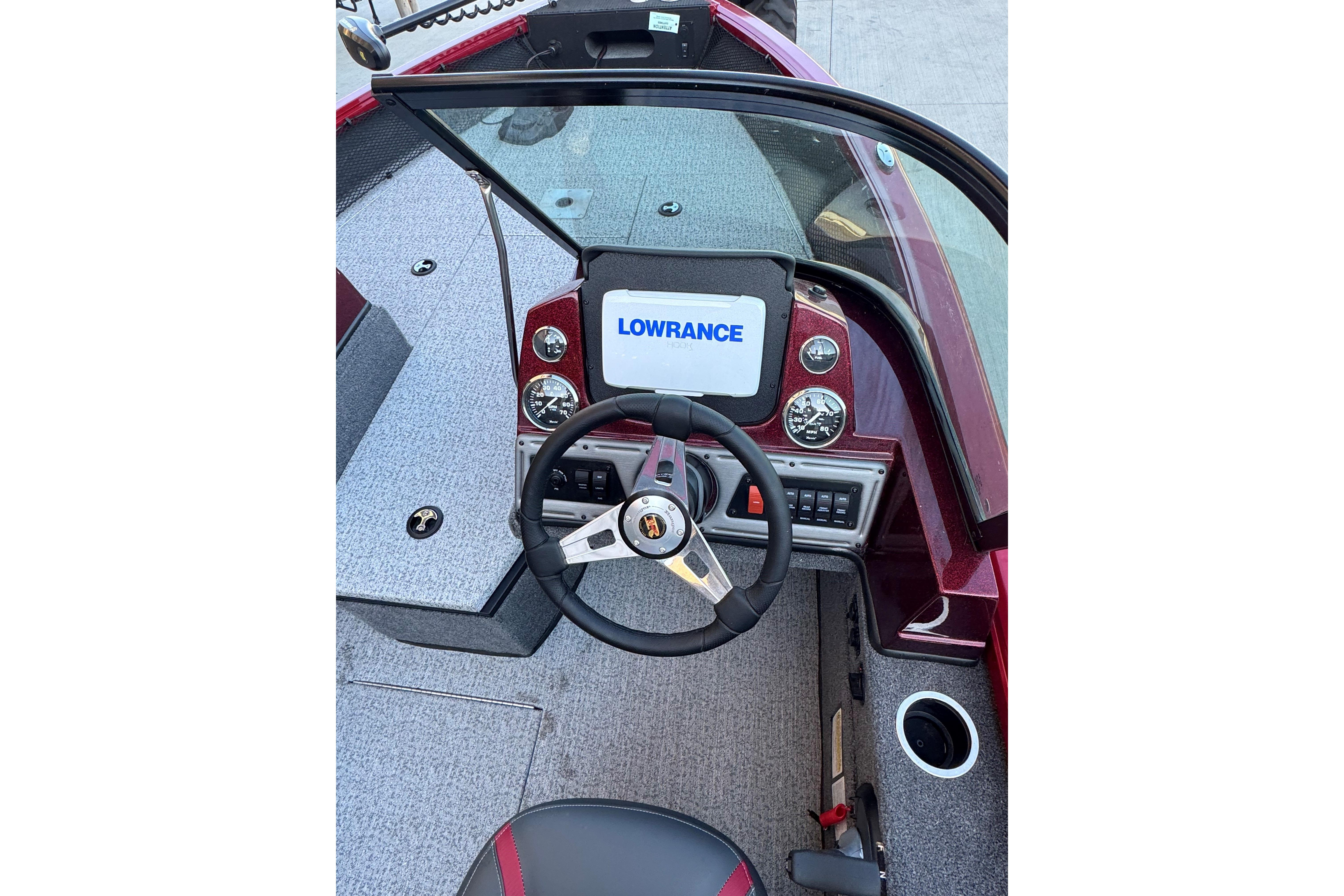 • Custom fiberglass console w/ flush mounted depthfinder, tach, speed, fuel, trim gauges & easy touch switching