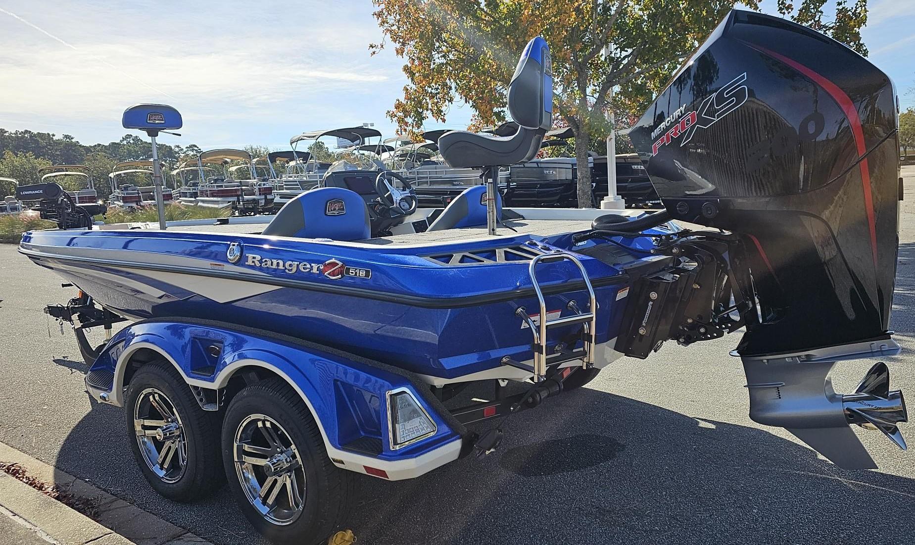 In the 18-foot class, the Ranger® Z518 stands alone in terms of all-out performance, fishability, and features. With the standard 150-horsepower Mercury®, you’ll enjoy invigorating performance and economy, but opting for the 200-horse V8 FourStroke opens the door to a new level of all-out adrenaline-pumping exhilaration. We’ve maximized storage space up front with a pair of 8-foot rod boxes, a gelcoat-lined, insulated in-deck cooler and spacious starboard gear box. The oversize casting deck and 97-inch beam deliver a stout, stable platform. A foam-filled core and strategically placed pultruded fiberglass material deliver unshakable solidity and a one-piece feel throughout. The console carries a full complement of precision gauges, the electronics of your choice up to 12” and stylish matte black accents. Integrated LED navigation lights, a recessed trolling motor pedal and SRS Soft-Ride™ seating round out this angler-centric rig that far outperforms its price tag. From daylight to dusk, the Ranger Z518 delivers features and value like none other.