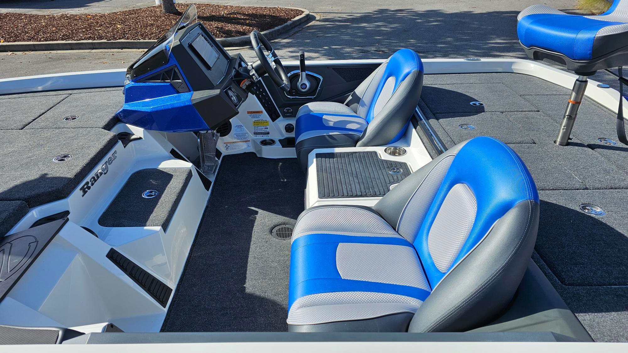 • Custom-fitted premium marine upholstery Soft Ride Seating (SRS) bucket seats w/ center storage, (1) bike seat w/ pro pole, (1) SRS fold-down w/ power pedestal