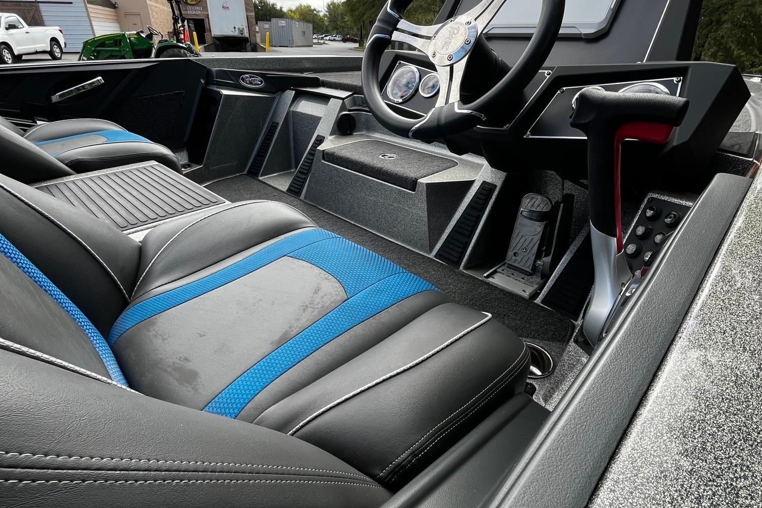 • Custom-fitted premium marine upholstery Soft Ride Seating (SRS) bucket seats w/ center storage, (1) bike seat w/ pro pole, (1) SRS fold-down w/ power pedestal
