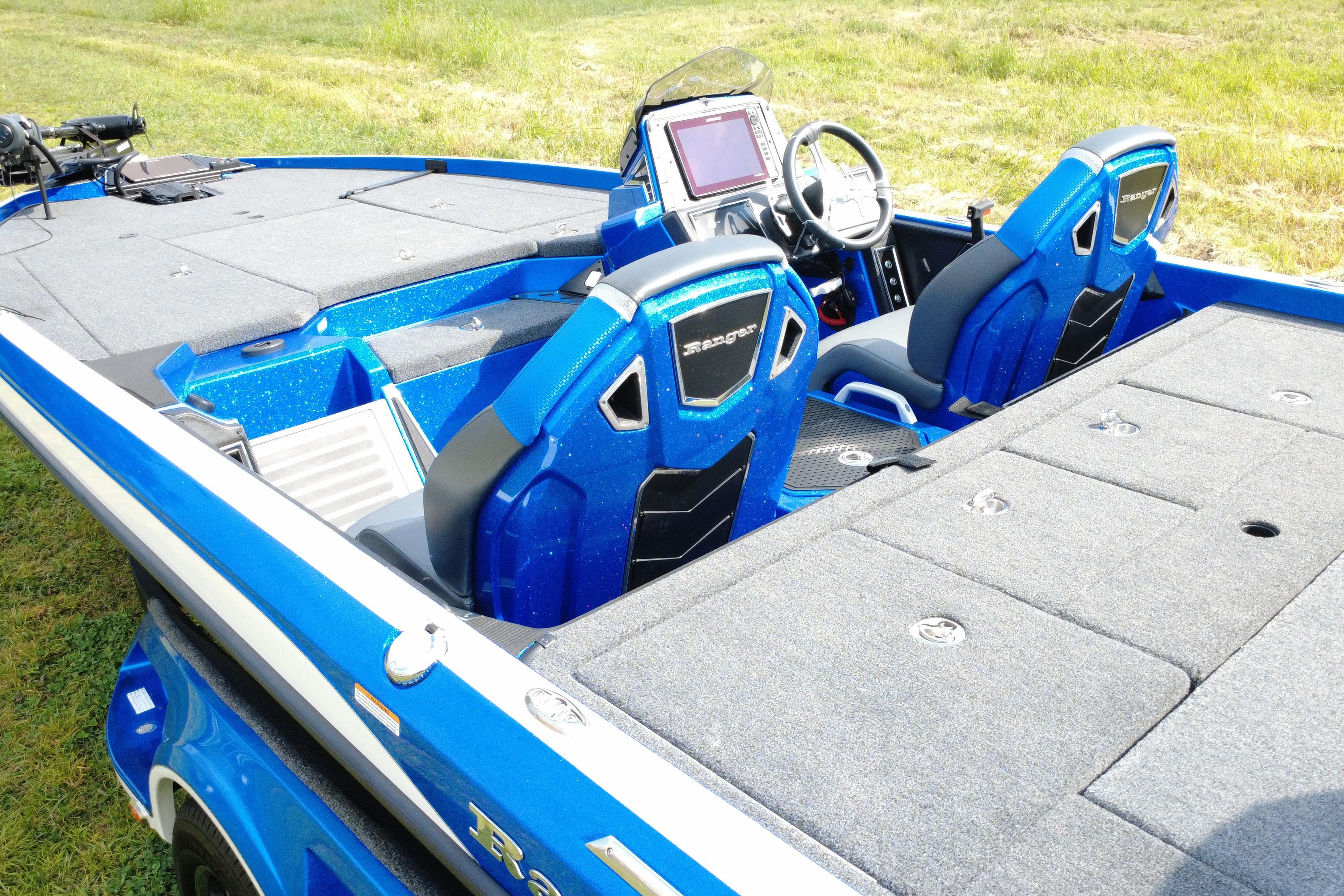 An all-new console carries dual graphs or a single 16” unit and the touchscreen Ranger R.I.D.E. system integrates total control over every boat and engine function. The all-new seats rest on easy-to-adjust slides and the color-matched fiberglass shellbacks take the aesthetic to a new level. A key fob and integrated push-to-start ignition let you start-up quicker and deliver greater security when you’re on the road. Inside the coin box is a wireless phone charger, and in the battery box are standard lithium batteries.