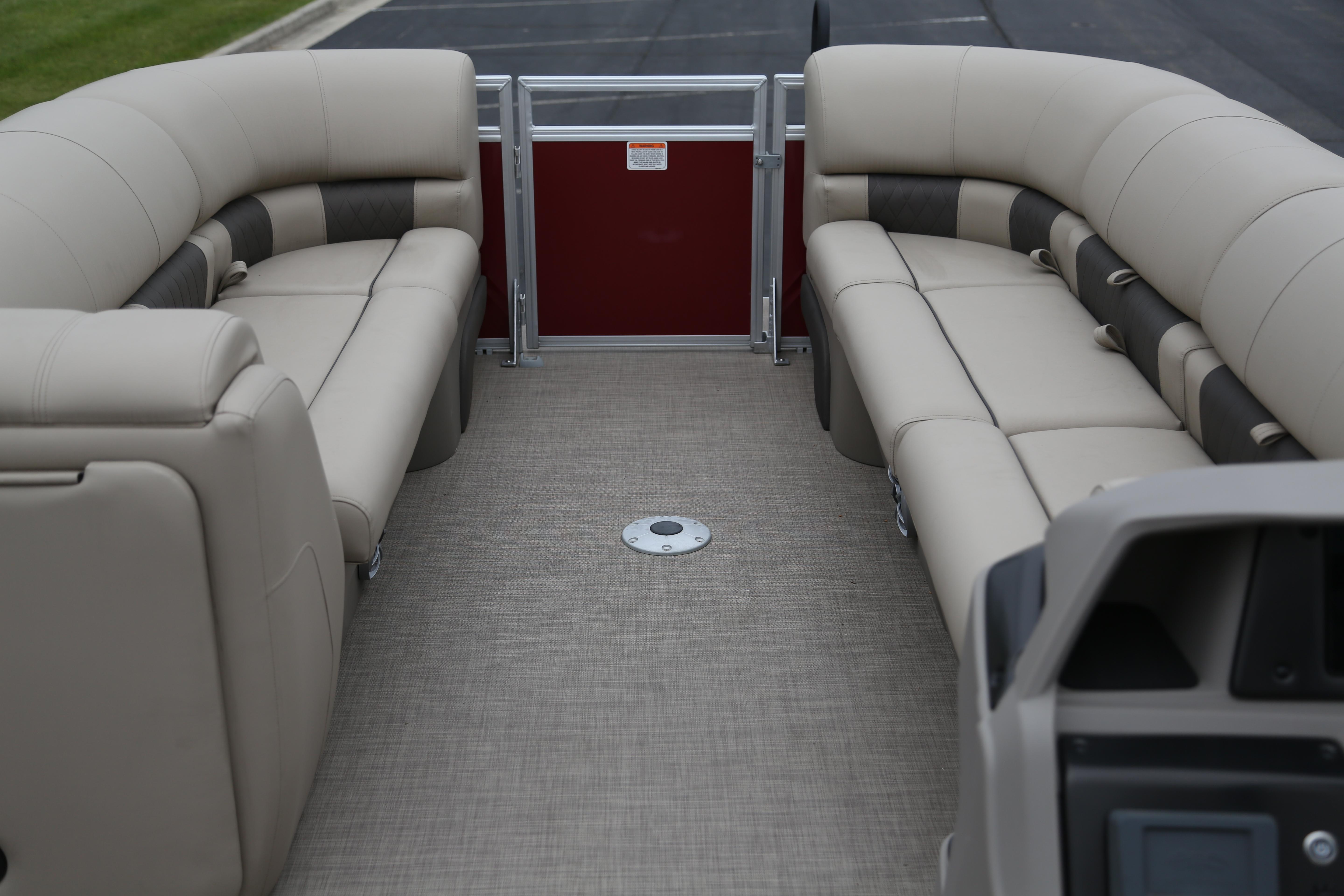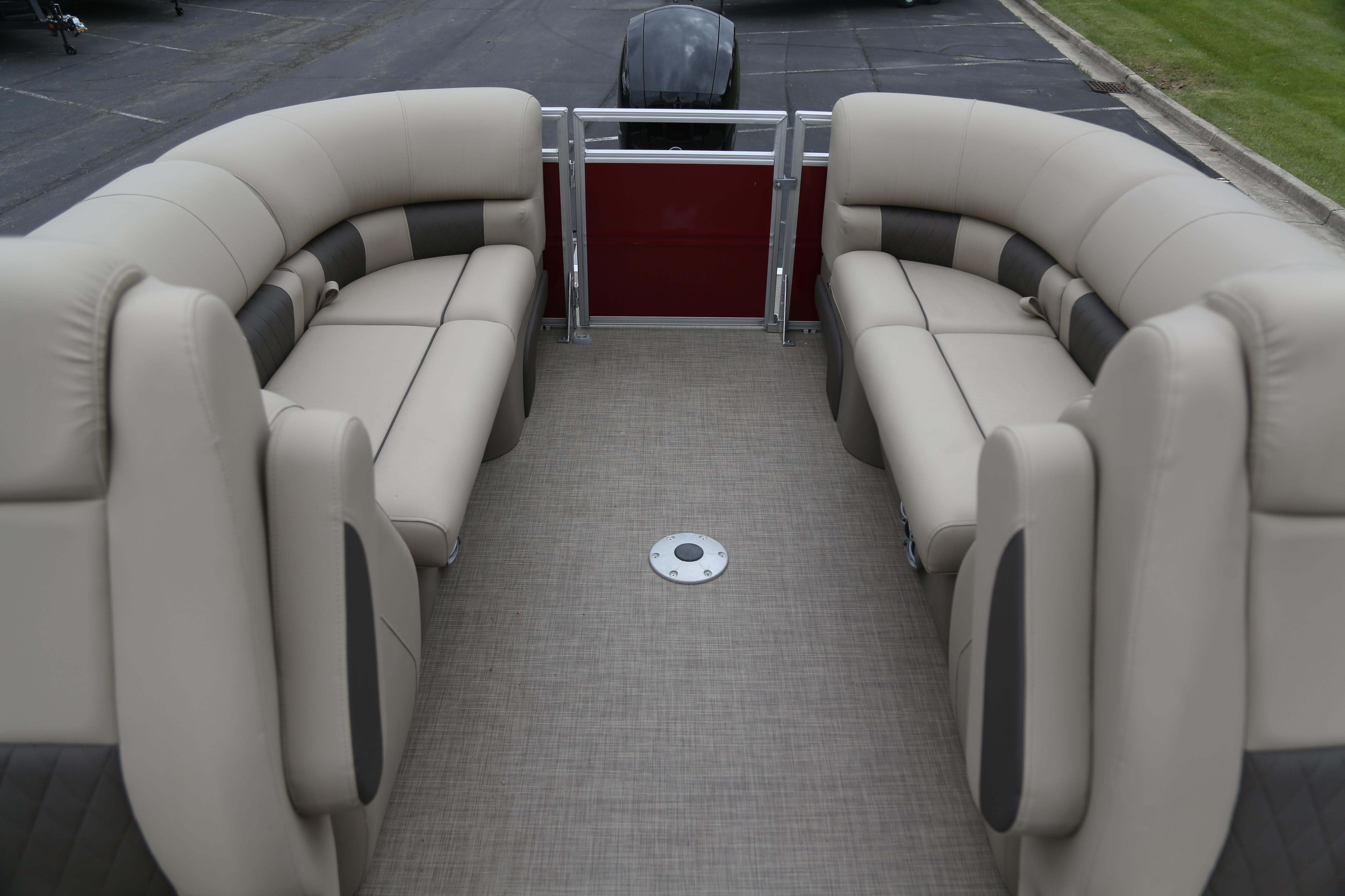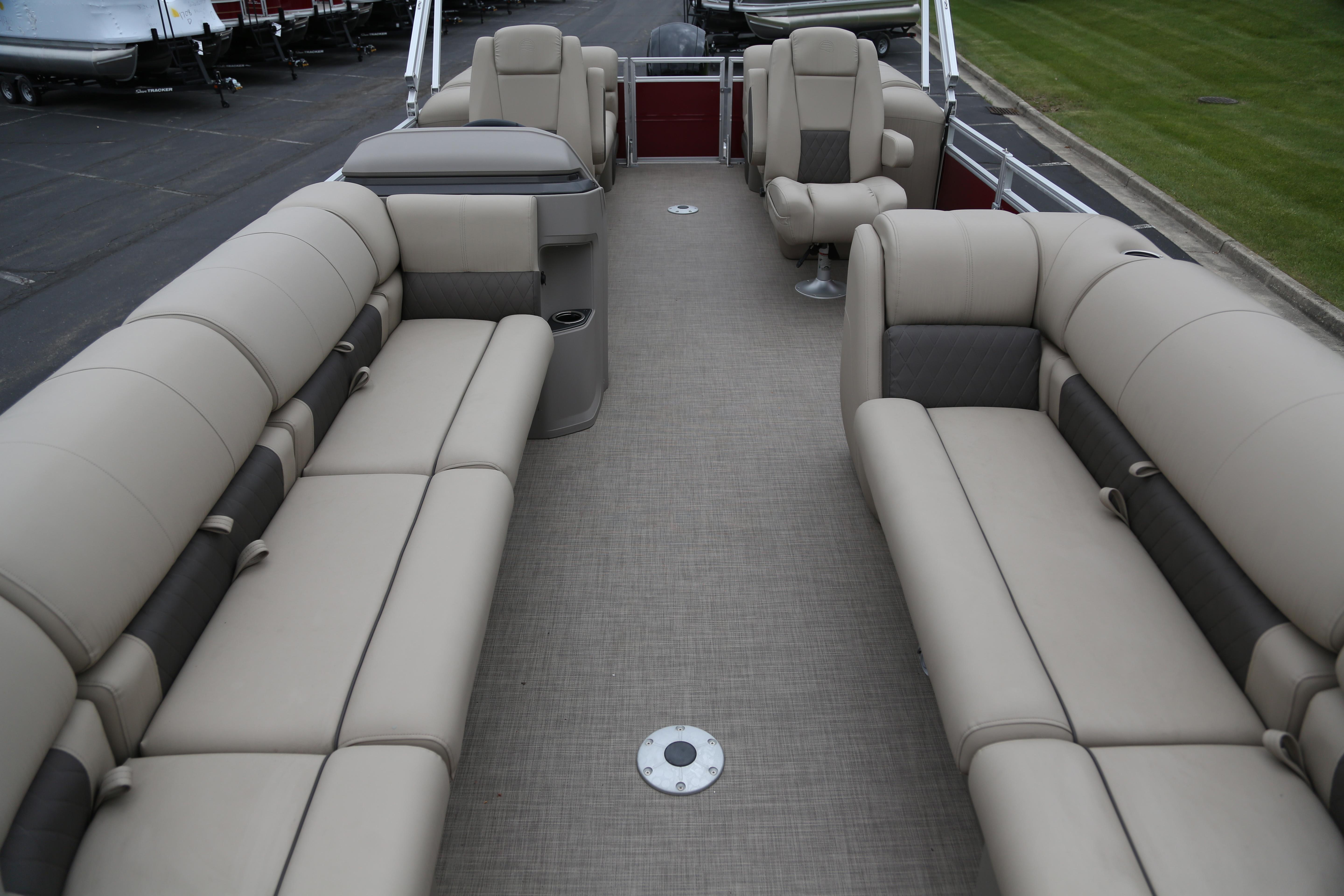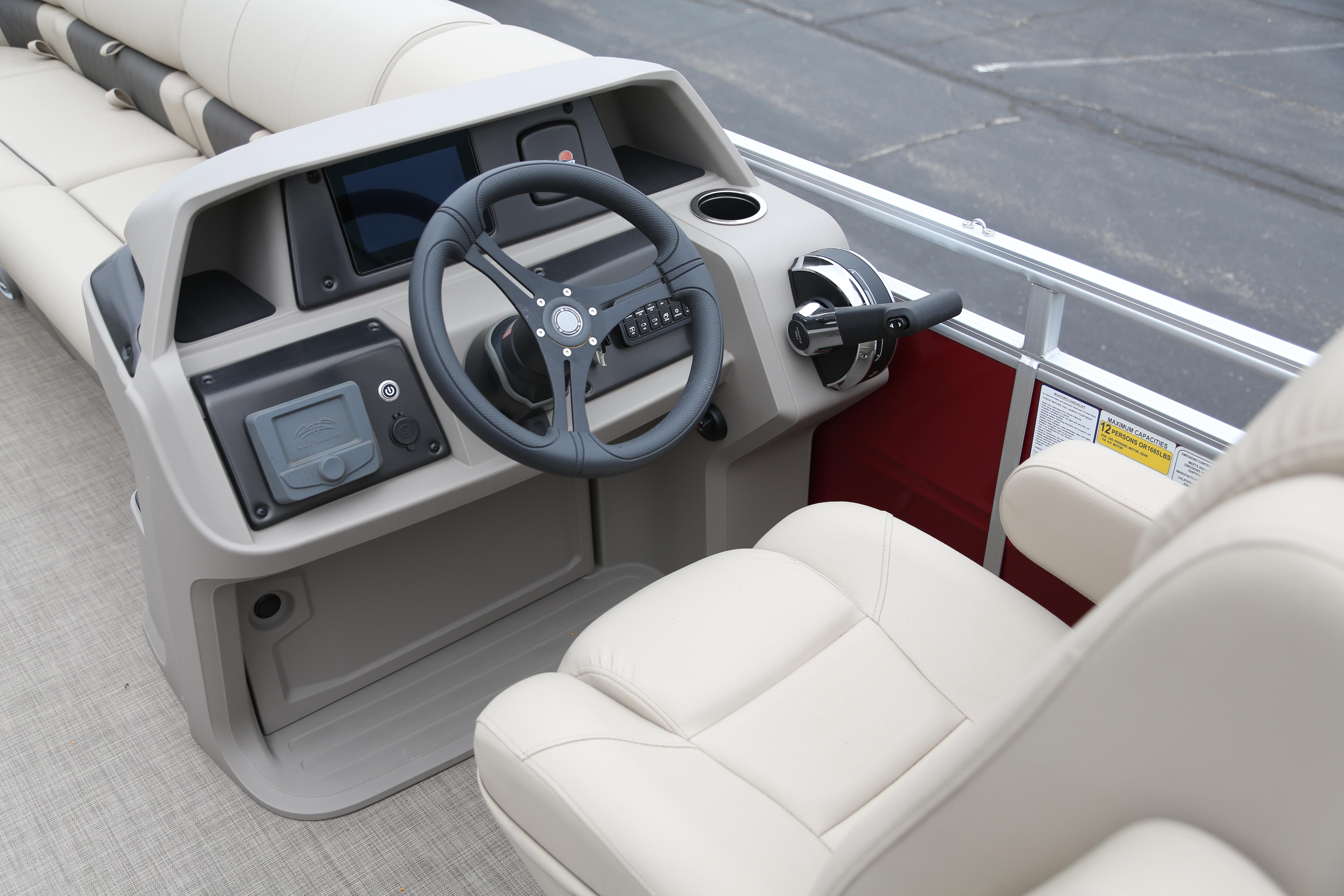 This PARTY BARGE® is lined with lounges in front of and behind the dual mid-deck captain's chairs. Those lounges feature the STOW MORE™ system, which places hidden storage spaces under the seats and behind the seat backs so you can keep all of your gear and supplies organized. The driver console also has an integrated storage space, as well as drink holders and a built-in footrest.