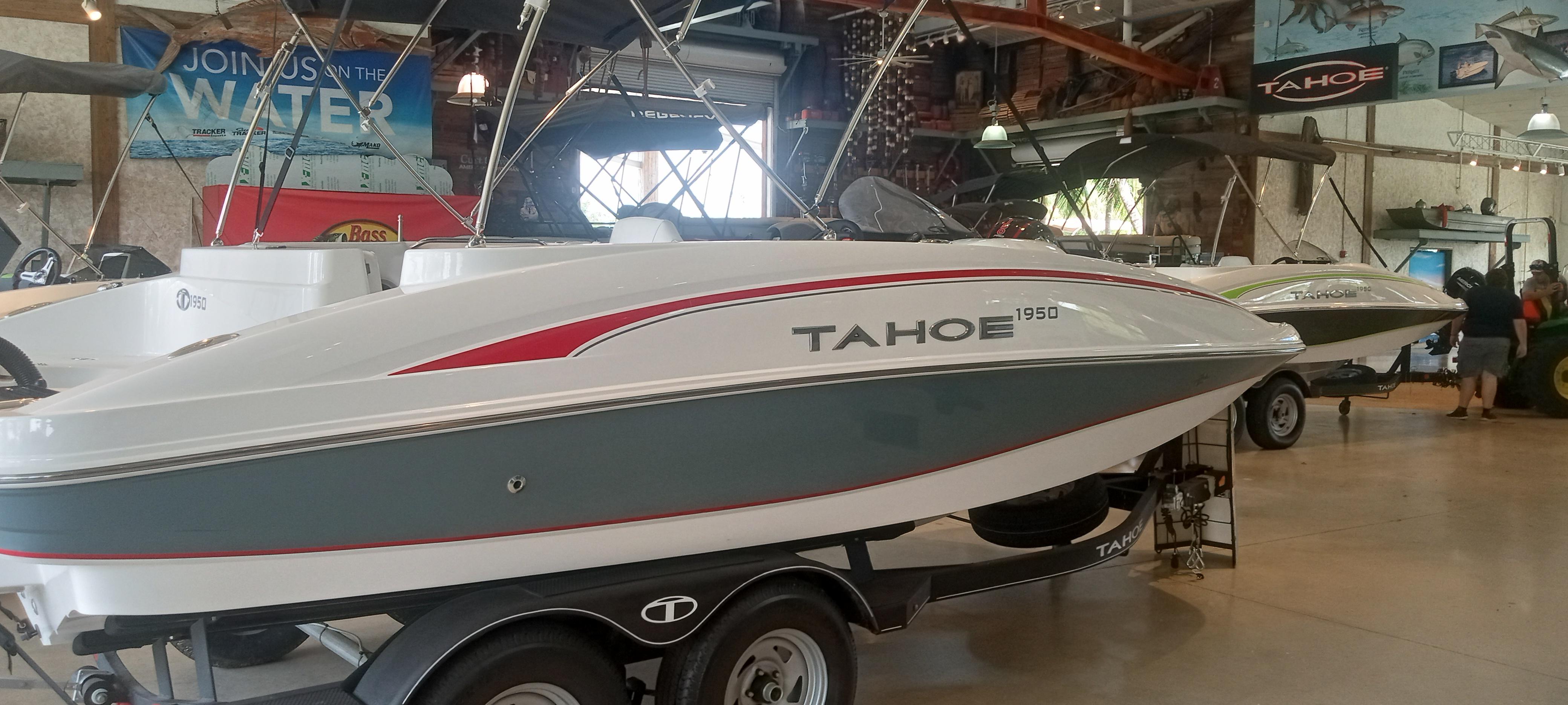 The TAHOE® 1950 deck boat lets you experience summer the right way—on the water with family and friends in bountiful luxury with exhilarating performance. Let your crew spread out on the ample lounges and benches, conveniently stowing all manner of gear throughout. At the helm you’ll find simple, reliable switching and gauges that keep you in the know at all times. A 36-qt. removable cooler keep things icy cold but when it’s time to fire it up, stout outboard power is a shove of the throttle away.