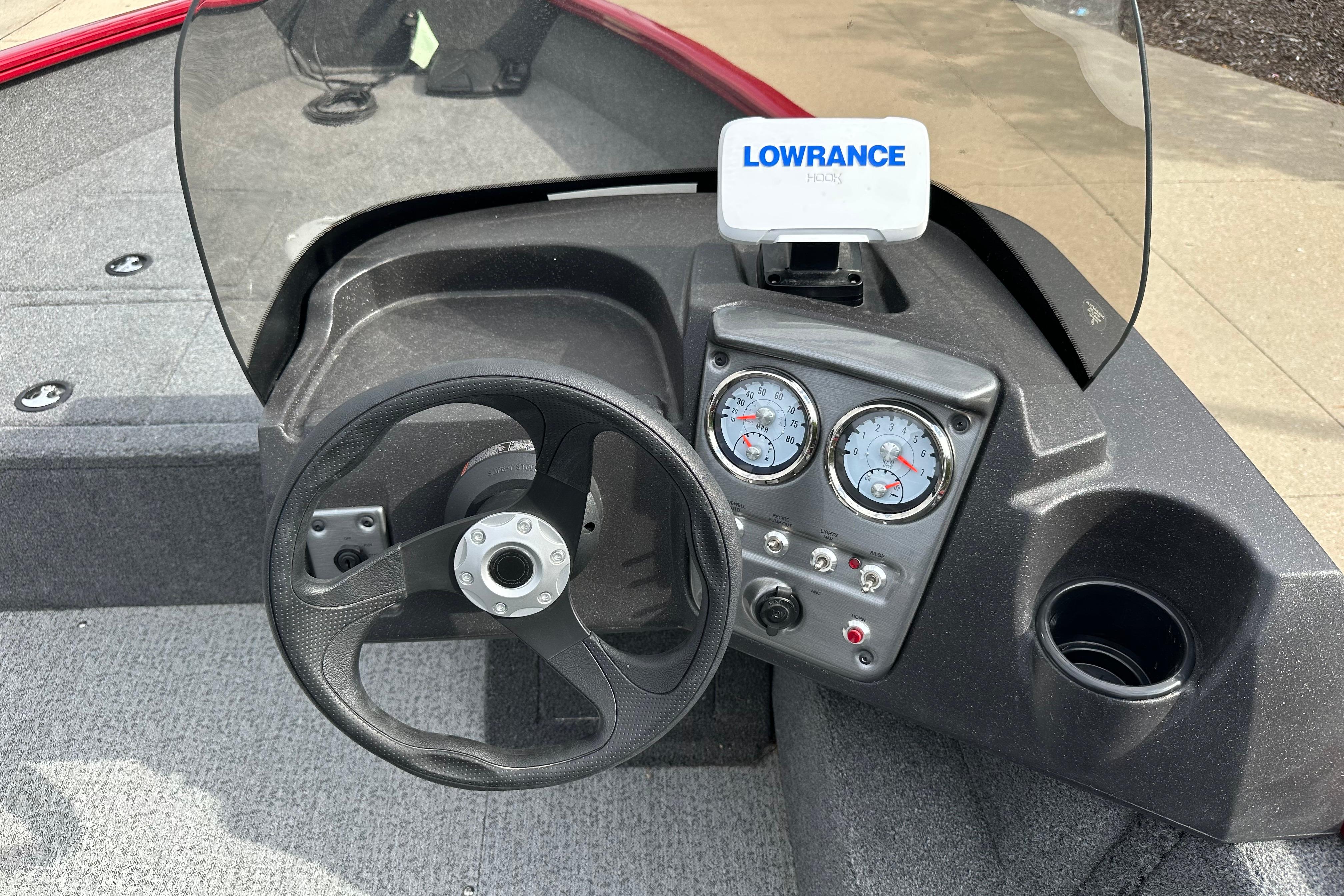 • Sleek fiberglass-reinforced console top w/tinted windscreen & built-in drink holder