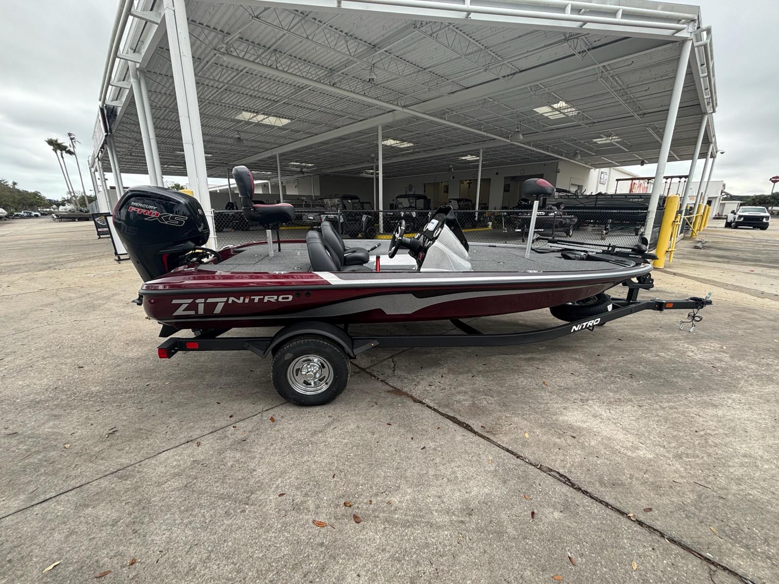 The NITRO® Z17 offers smooth, economical performance in a nimble size that's easy to tow, stow, and own. Reliable power from a FourStroke Mercury® outboard stands by to ramp up the fun with the jab of the throttle, while the NITRO® NVT™ hull offers quick planing and acceleration with on-rails handling at speed. The wide beam offers room for multiple anglers, stability in all conditions, and a world of storage beneath the decks. Lockable rod lockers carry sticks up to 7'6", while dedicated tackle stows in the rear deck keep boxes organized, dry, and readily accessible. The helm features a standard Lowrance® fishfinder, a full gauge set, and reliable switching for maximum convenience. Underneath the Z17 is a custom-fitted trailer made just for the hull it's carrying that promises years of smooth and hassle-free trailering. The Z17 is the perfect value- and feature-packed package that won't break the bank, but help you put checks in it.