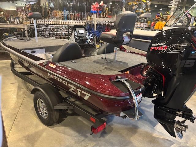 The NITRO® Z17 offers smooth, economical performance in a nimble size that's easy to tow, stow, and own. Reliable power from a FourStroke Mercury® outboard stands by to ramp up the fun with the jab of the throttle, while the NITRO® NVT™ hull offers quick planing and acceleration with on-rails handling at speed. The wide beam offers room for multiple anglers, stability in all conditions, and a world of storage beneath the decks. Lockable rod lockers carry sticks up to 7'6", while dedicated tackle stows in the rear deck keep boxes organized, dry, and readily accessible. The helm features a standard Lowrance® fishfinder, a full gauge set, and reliable switching for maximum convenience. Underneath the Z17 is a custom-fitted trailer made just for the hull it's carrying that promises years of smooth and hassle-free trailering. The Z17 is the perfect value- and feature-packed package that won't break the bank, but help you put checks in it.