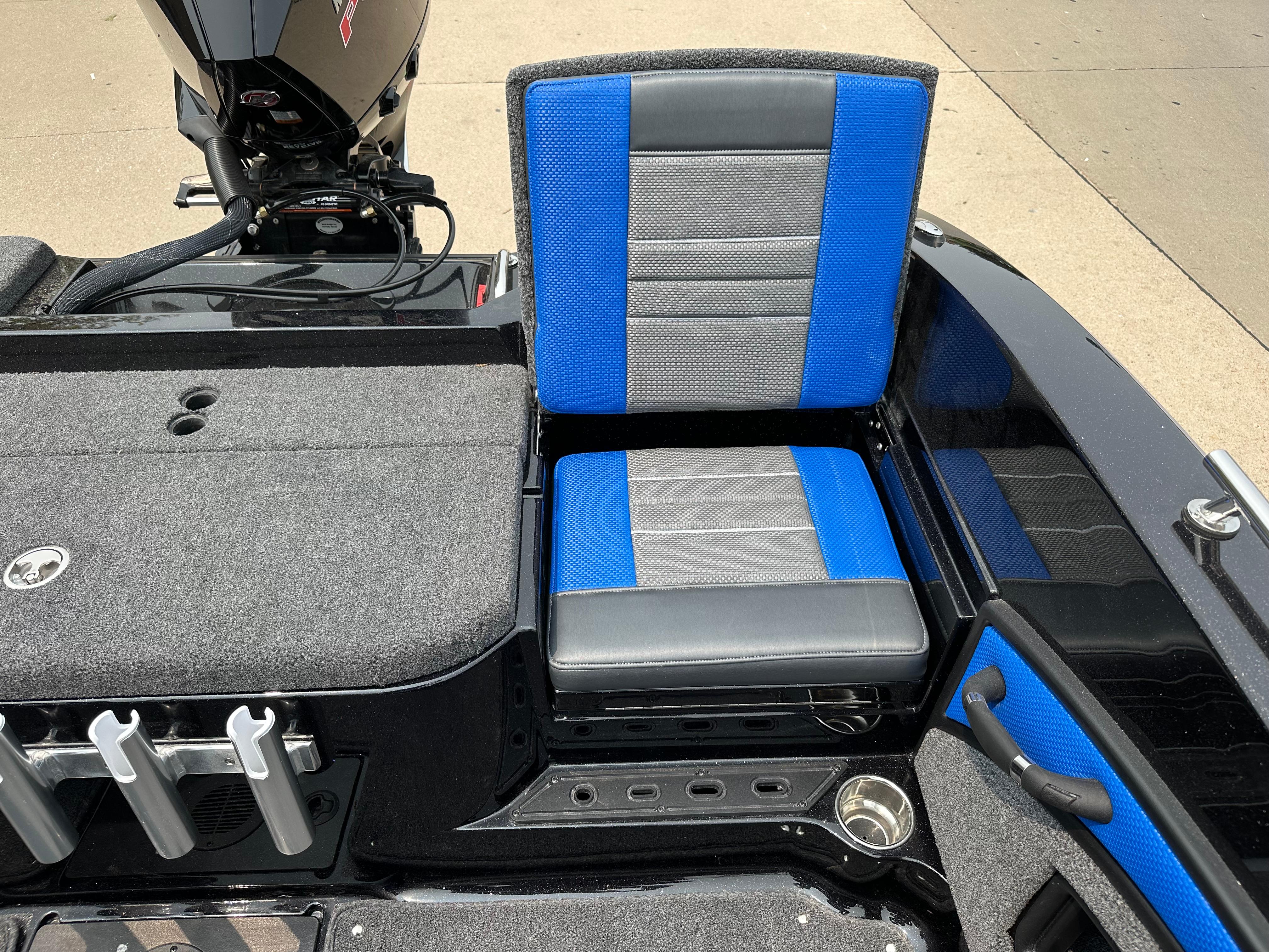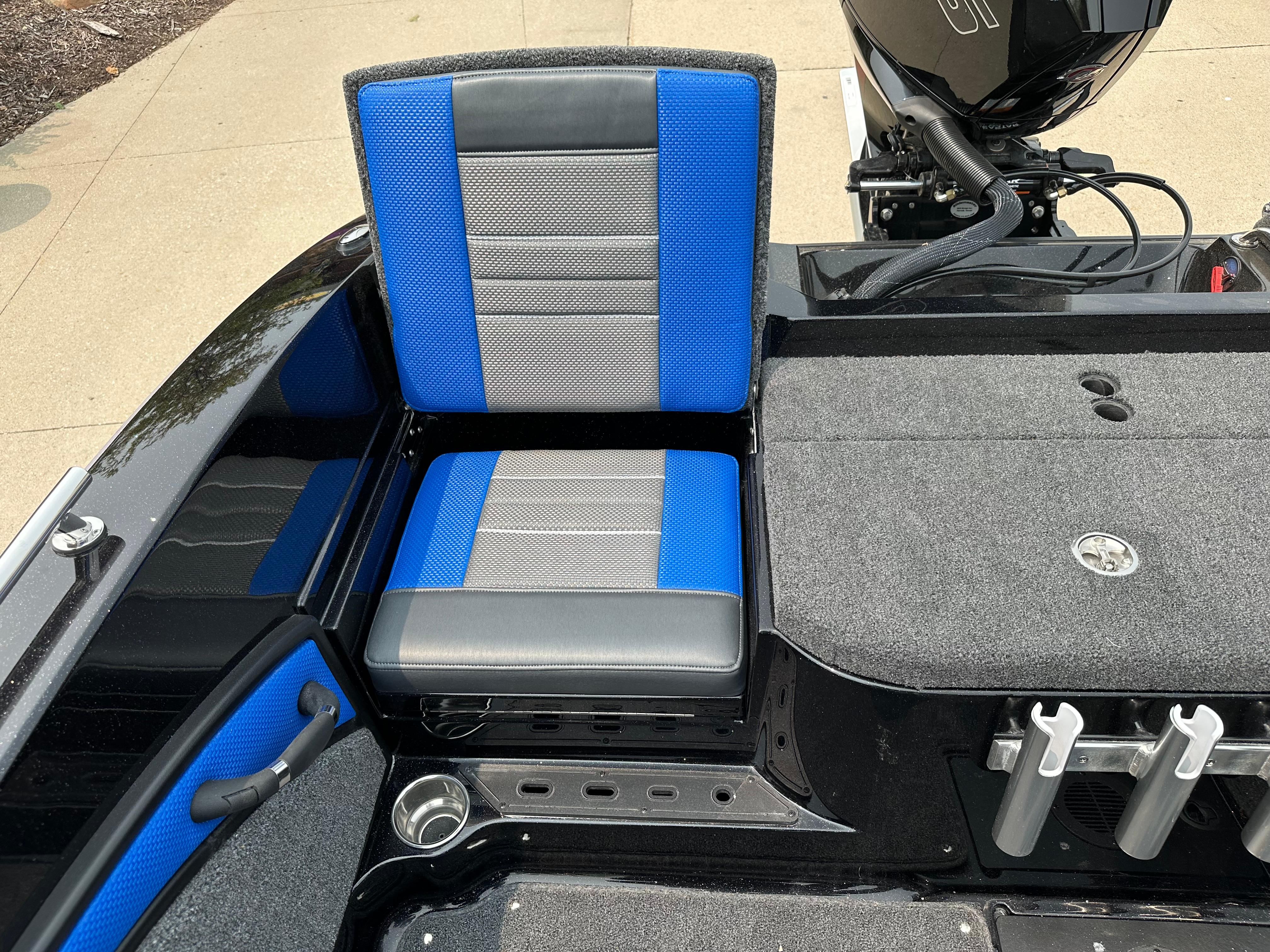 • Custom-fitted premium marine upholstery - (4) Soft Ride Seating (SRS) fold-downs w/ (2) bell pedestal with adjustable slide and (2) 15" non-adjustable posts