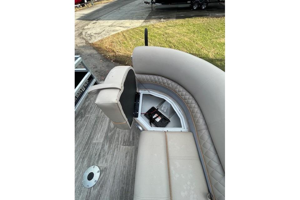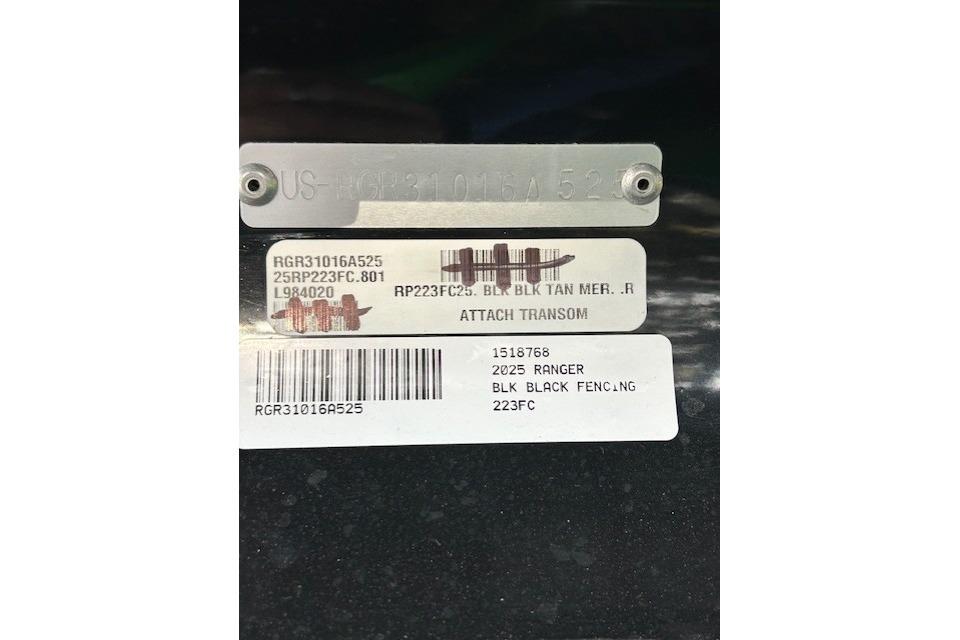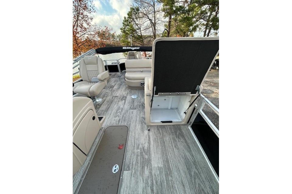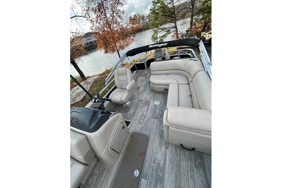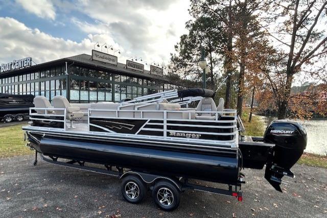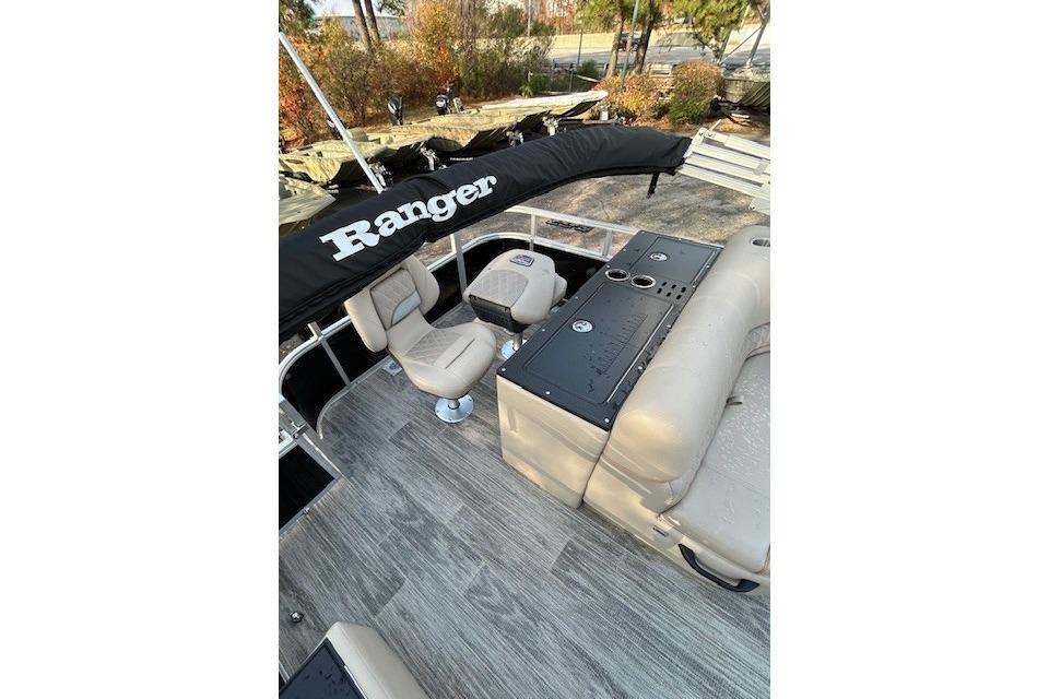 Maximize your fishing pontoon's space and power! The 2025 Ranger® Reata® 223FC Fish & Cruise delivers exciting days not only for anglers, but for everyone looking for fun on the lake. This is the biggest Fish & Cruise crossover in the Ranger® lineup—and the most luxurious. Its layout is engineered to give up to 11 friends and family a comfortable and exciting space. 2 lounges, 2 reclining port chairs with self-leveling arms, and a deluxe captain's chair are built for relaxing. The pilot sits before a fiberglass console equipped with a Wet Sounds® stereo, digital dash touch screen, and a 12-button switch panel over an in-console cooler compartment to keep beverages close by. Serious anglers can grab their setups from the lockable rod compartment and set up shop in 1 of the 2 chairs in the aft fishing deck. This deck also sports an aerated livewell and a holder for your rods and tools. If the sun's beating down overhead, expand the color-matched 10' bimini top for some shade so you can fish the day away. The 2025 Ranger® Reata® 223FC comes standard with a 200hp Mercury® L FourStroke outboard motor and has a recommended maximum 200hp rating.
