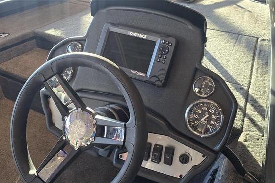 • Custom fiberglass console w/ flush-mounted depthfinder, tach, speed, fuel, trim gauge & easy touch switching