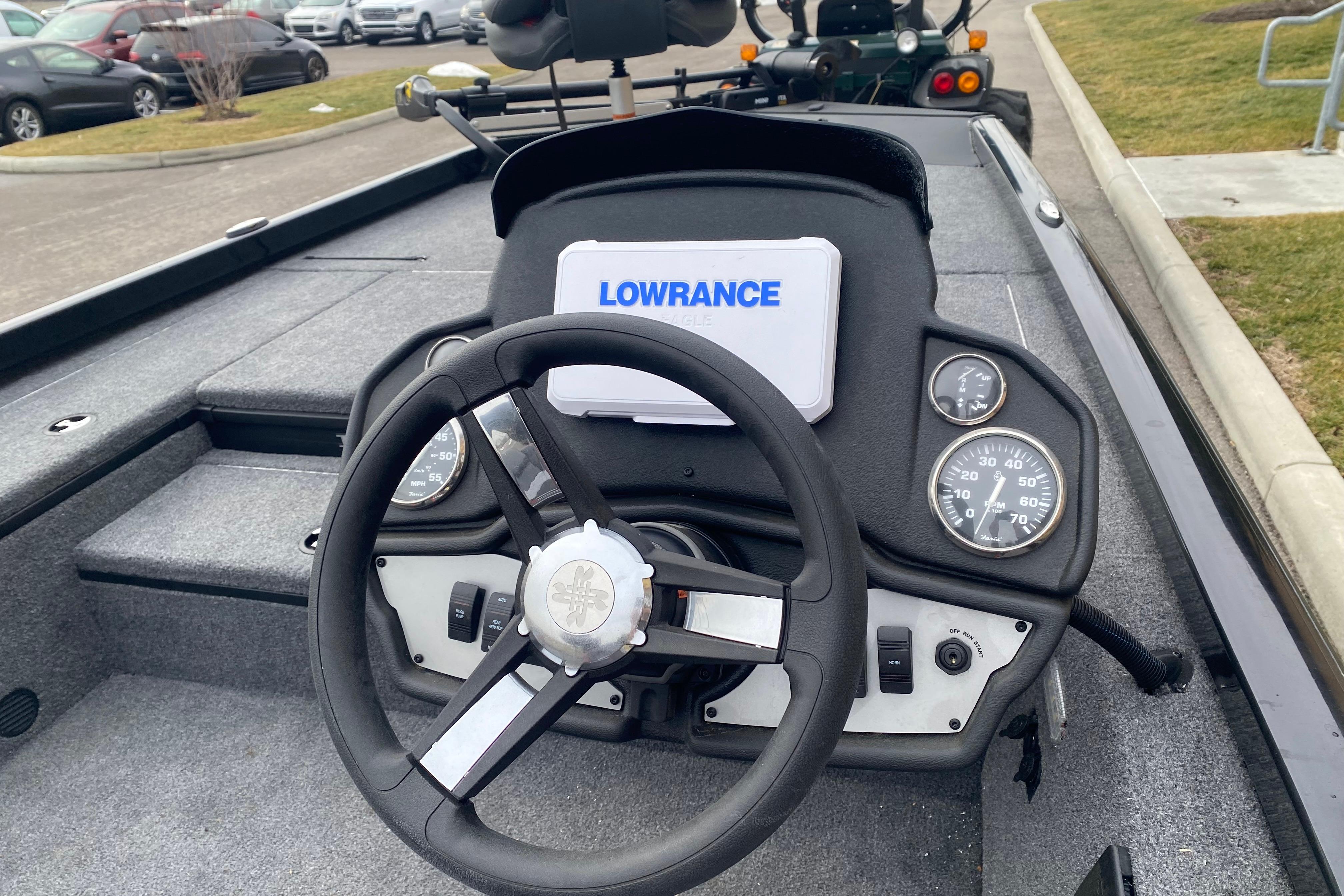 • Custom fiberglass console w/ flush-mounted depthfinder, tach, speed, fuel, trim gauge & easy touch switching