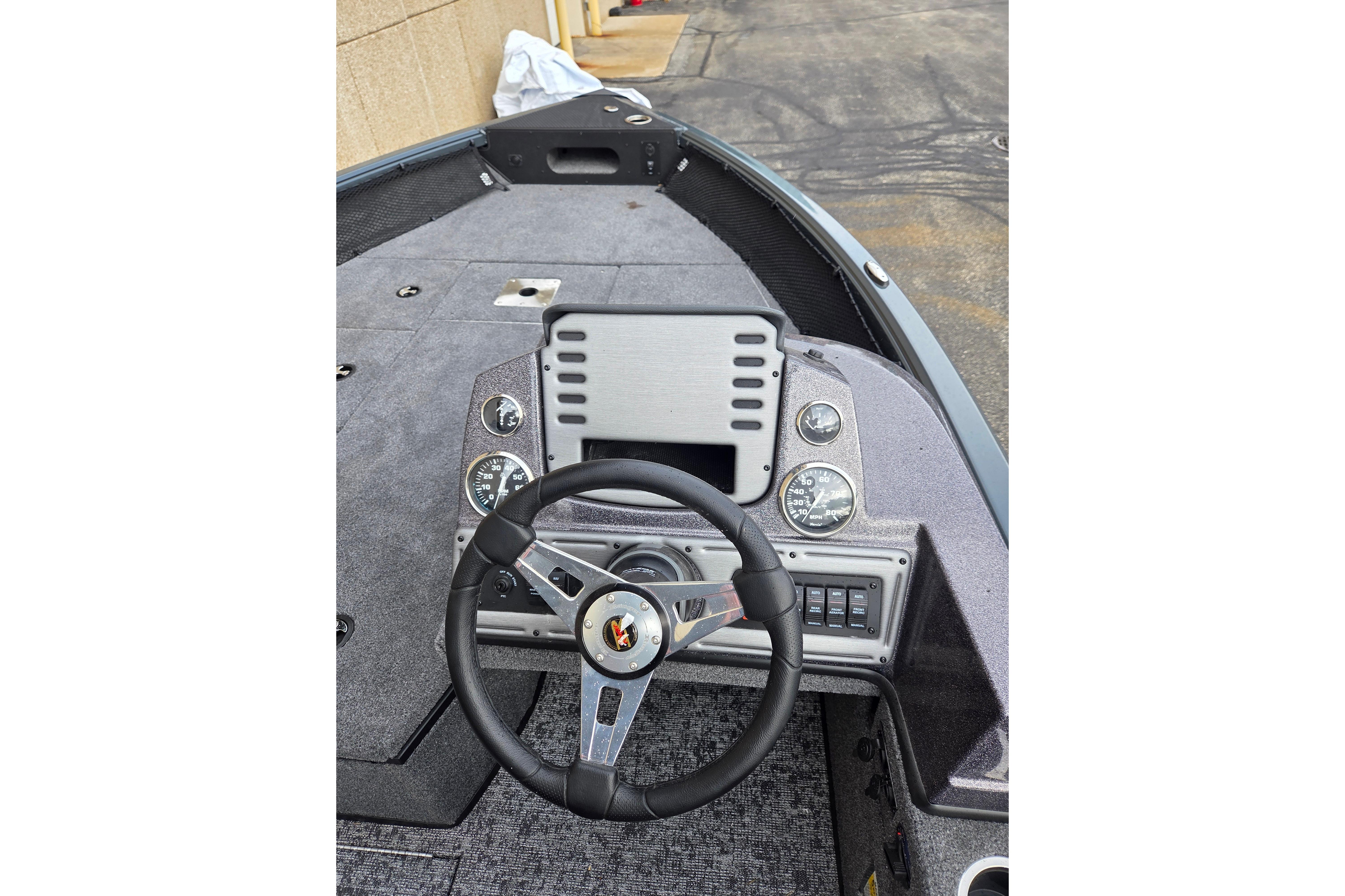 • Custom fiberglass console w/ flush mounted depthfinder, tach, speed, fuel, trim gauges & easy touch switching