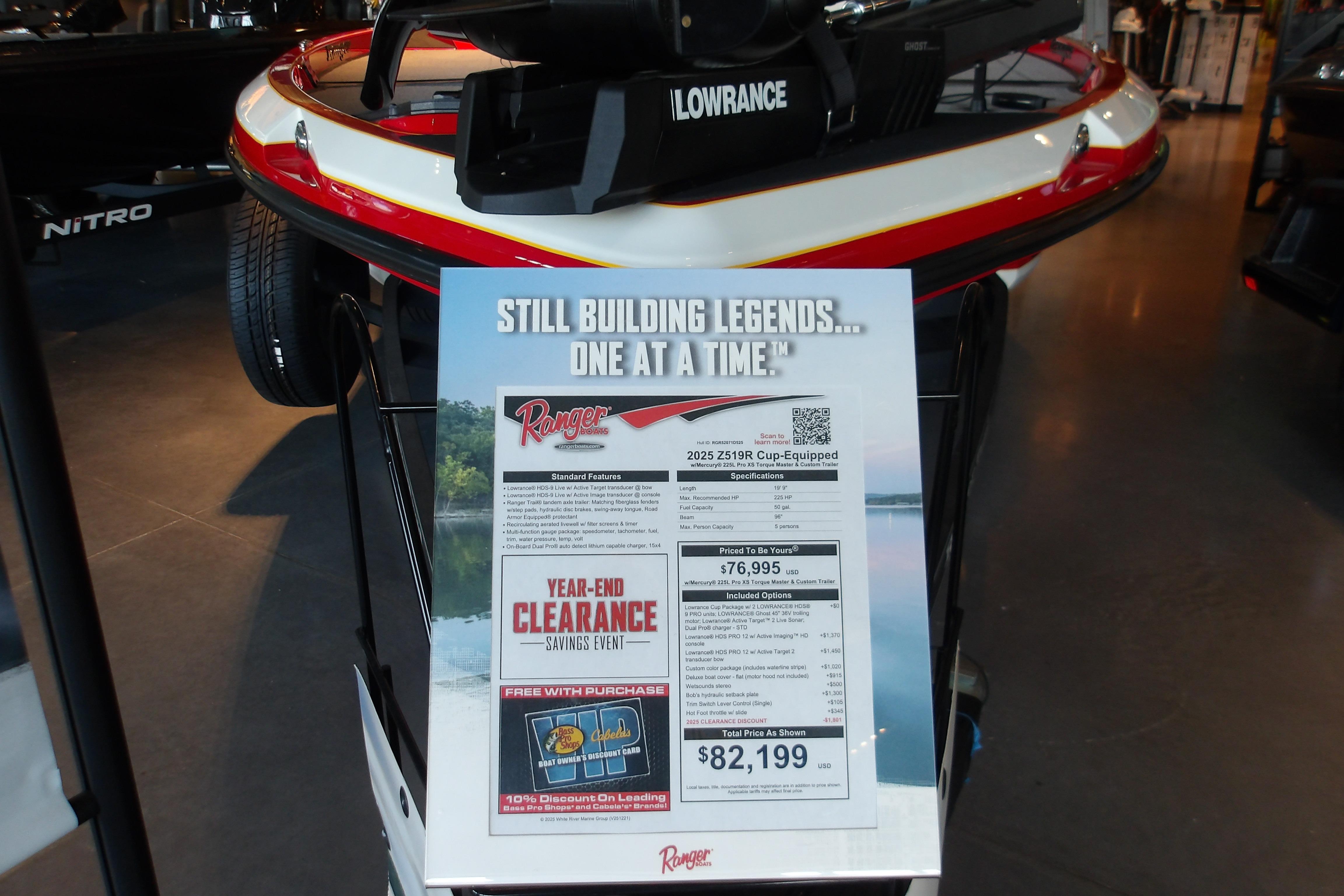 The Z519R is the latest in Ranger’s premium R Series lineup, and it comes fully loaded with premium add-ons that give you pro-level capability, packaged for a price savings. Brimming with top-tier features, the Z519R has the fishability and all-around performance you’ve come to expert from Ranger with added touches to set you off on the water and at the ramp. Our proprietary Echelon™ rod storage system keeps loads of sticks secure and handy, while reducing hassle when fetching one. A padded front deck is adorned with push-to-close latches that eliminate tripping hazards associated with twist-to-close latches, and color-matched cockpit liner and compartments liners add classy functionality. Analog switching makes for easy adjustments on the fly, and an insulated 40-quart center step cooler holds more than a day’s worth of drinks. The Ranger touchscreen multifunction display puts engine parameters at your fingertips, while smooth, responsive steering gives effortless control of 225 horses in the Mercury® FourStroke V8. A refined running surface delivers on-rails handling at speed as well as unbeatable edge-to-edge stability on the trolling motor. A vast front deck gives ample space for two, and a world of storage underfoot. The Z519R is the latest in a long line of premium bassin’ rigs that stem from our unwavering Passion for Perfection™.