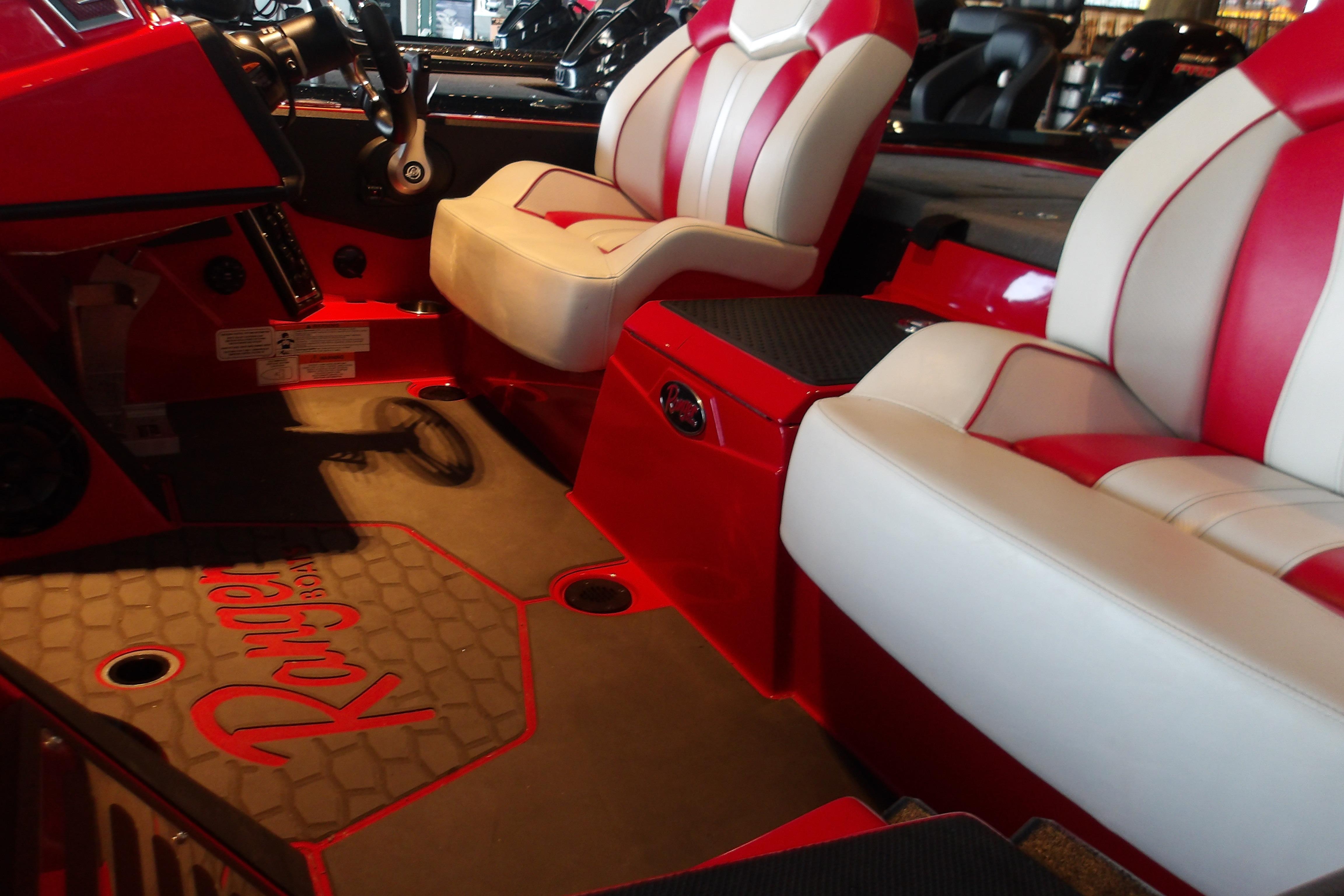 • Custom-fitted premium marine upholstery - Soft Ride Seating (SRS) bucket seats w/ color-matched fiberglass seat shell, coin box, (1) bike seat w/ pro pole, & (1) SRS all-weather fold down w/ power pedestal
