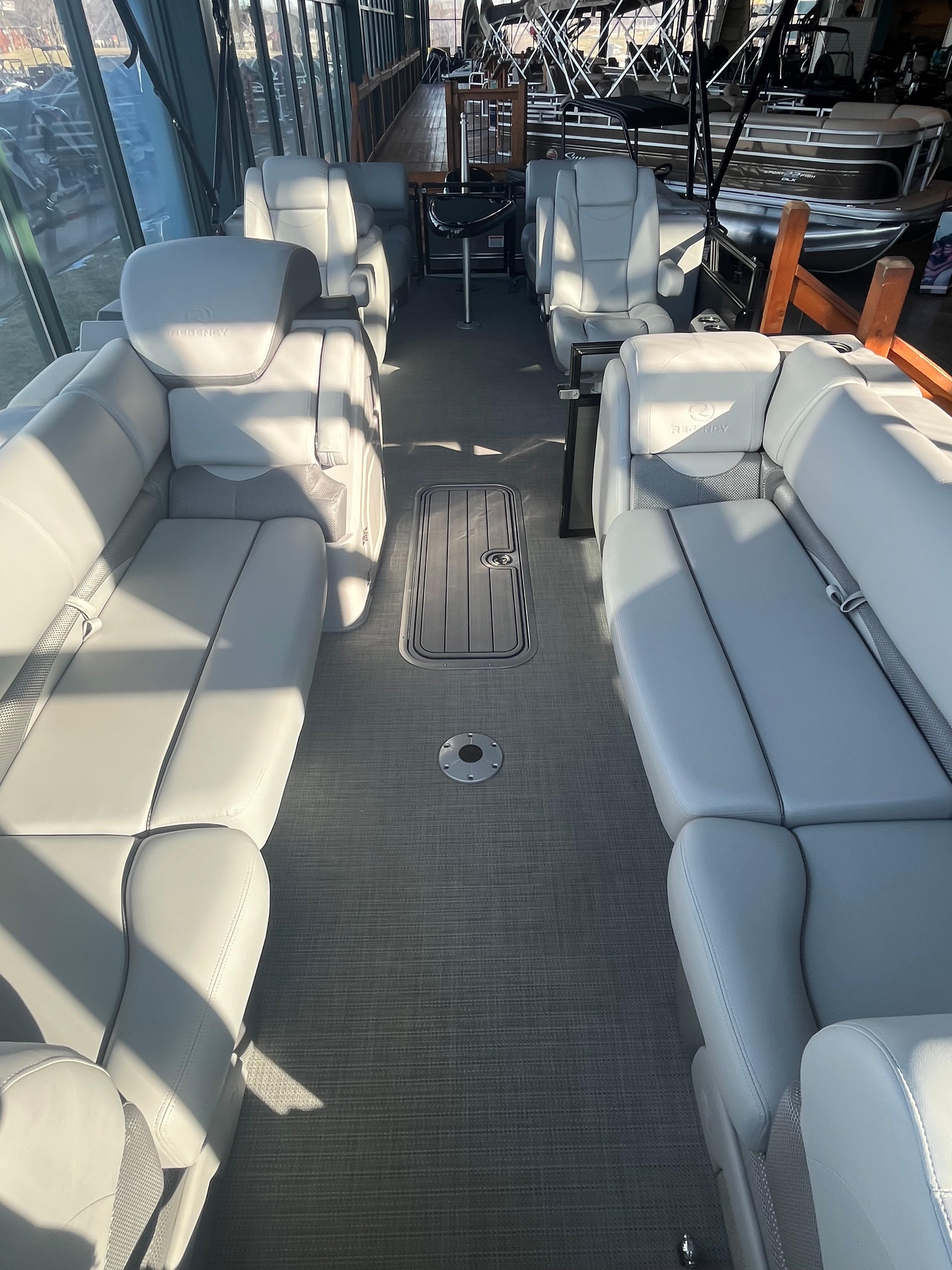 Enjoy the bow-to-stern soft-touch woven flooring that remains cool and slip-resistant throughout the summer. And when it’s time to ramp up the fun, unleash up to 250 horsepower with a jab of the throttle. The FourStroke Mercury® engine harmonizes flawlessly with the tritoon's impeccable handling, courtesy of the trio of 26-foot powder-coated logs equipped with LED accent lighting for a striking appearance after dark.