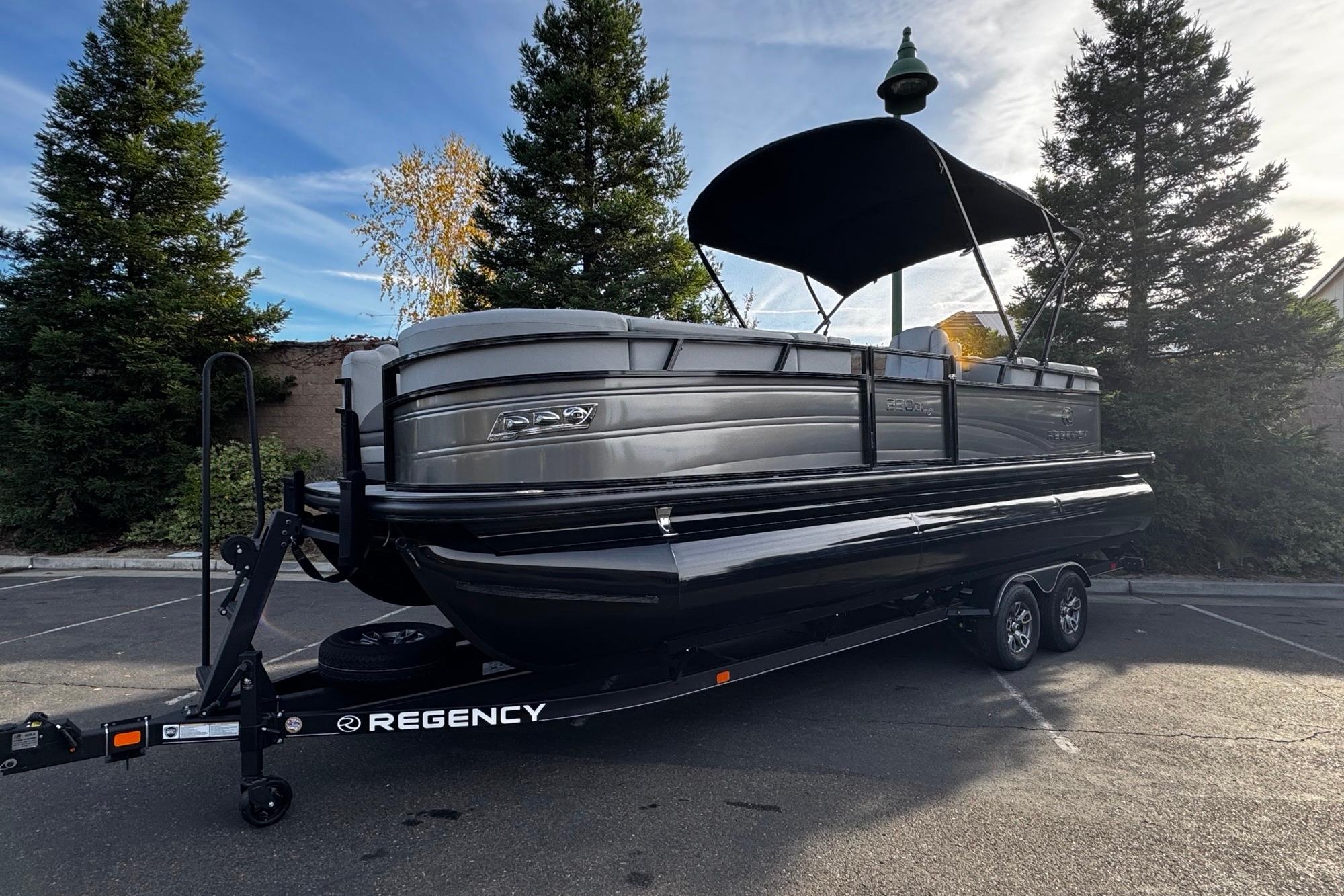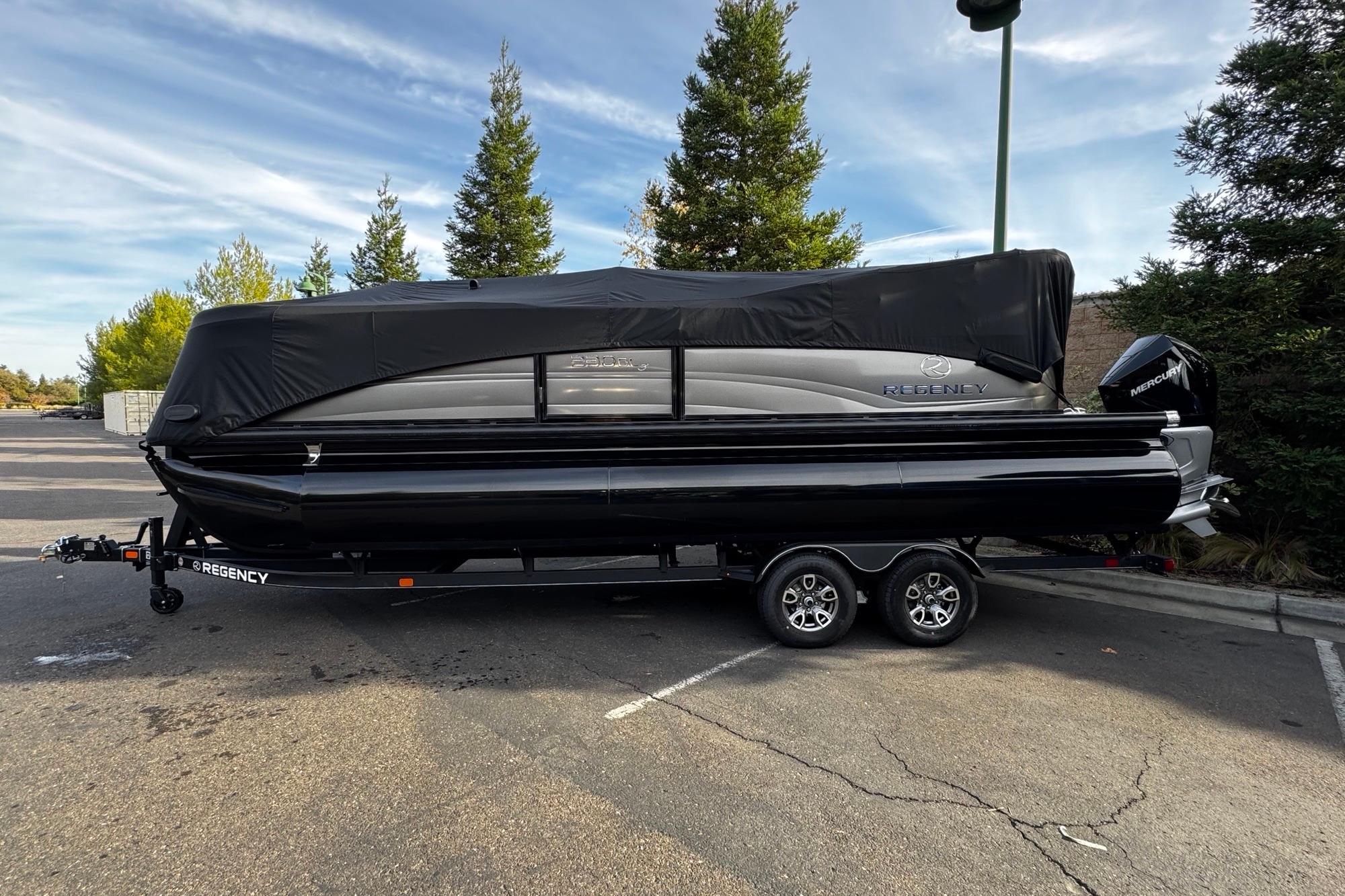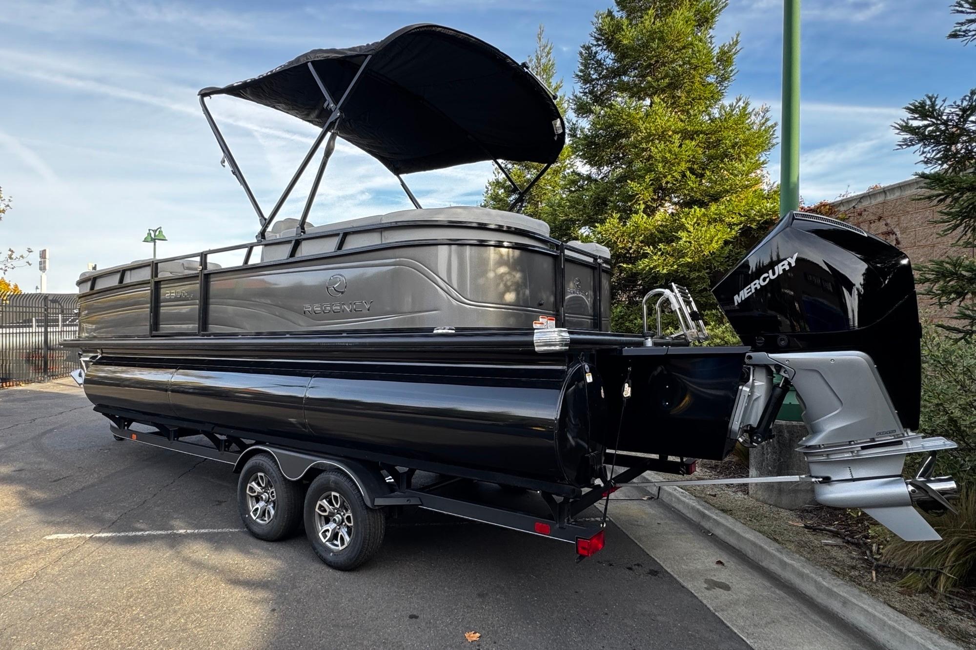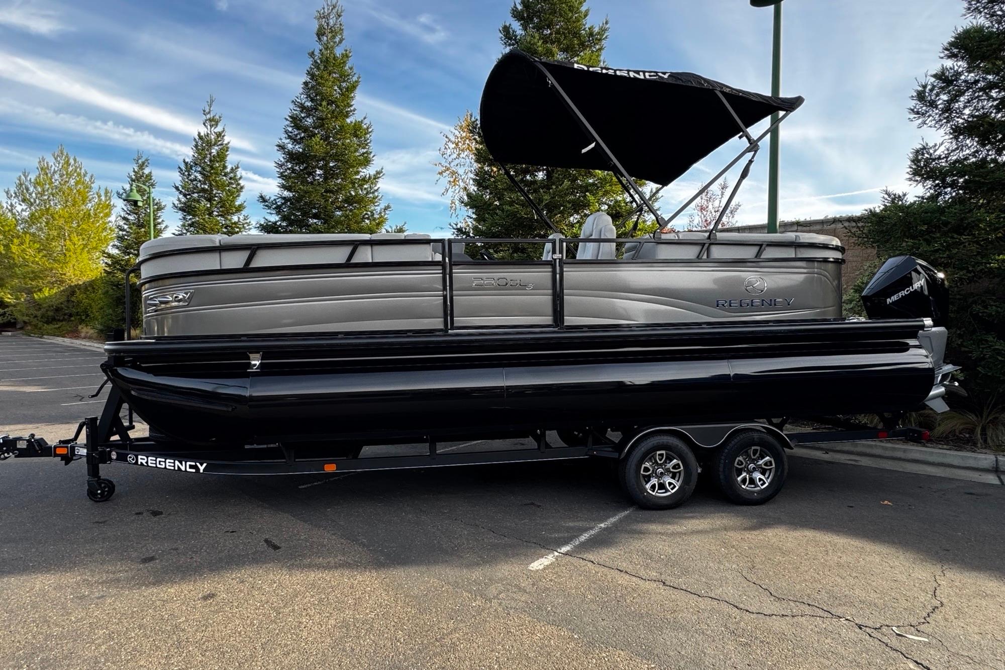 Pricing includes a Mercury 250HP motor, tandem axle trailer and mooring cover. Color is charcoal interior with charcoal fencing and black powder coated logs.
