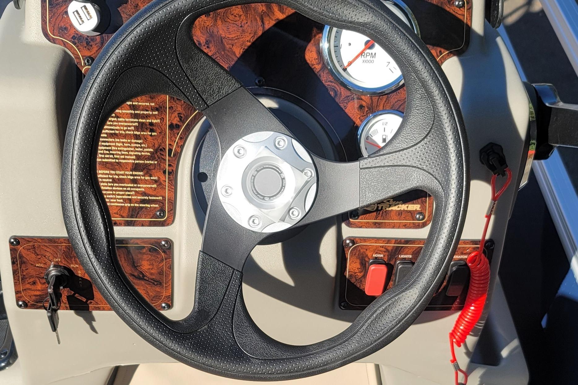 • 9' (2.74 m) SUN TRACKER® QuickLift™ Bimini top w/LED courtesy lights, storage pockets & protective boot (color-coordinated Sand w/Copper Red or Indigo Blue fencing)