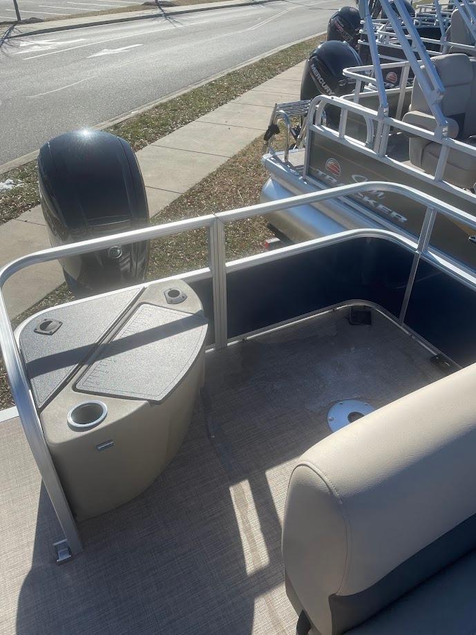• Front fishing station w/2 pedestal seat bases; rail-mounted rod & tool holders; & bow starboard storage compartment w/rod & drink holders