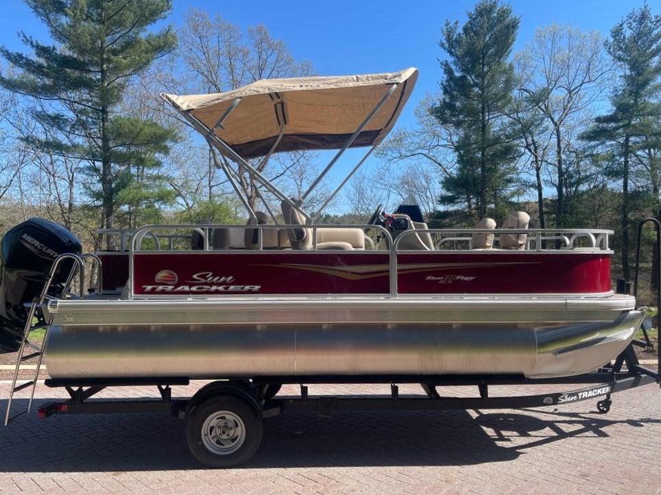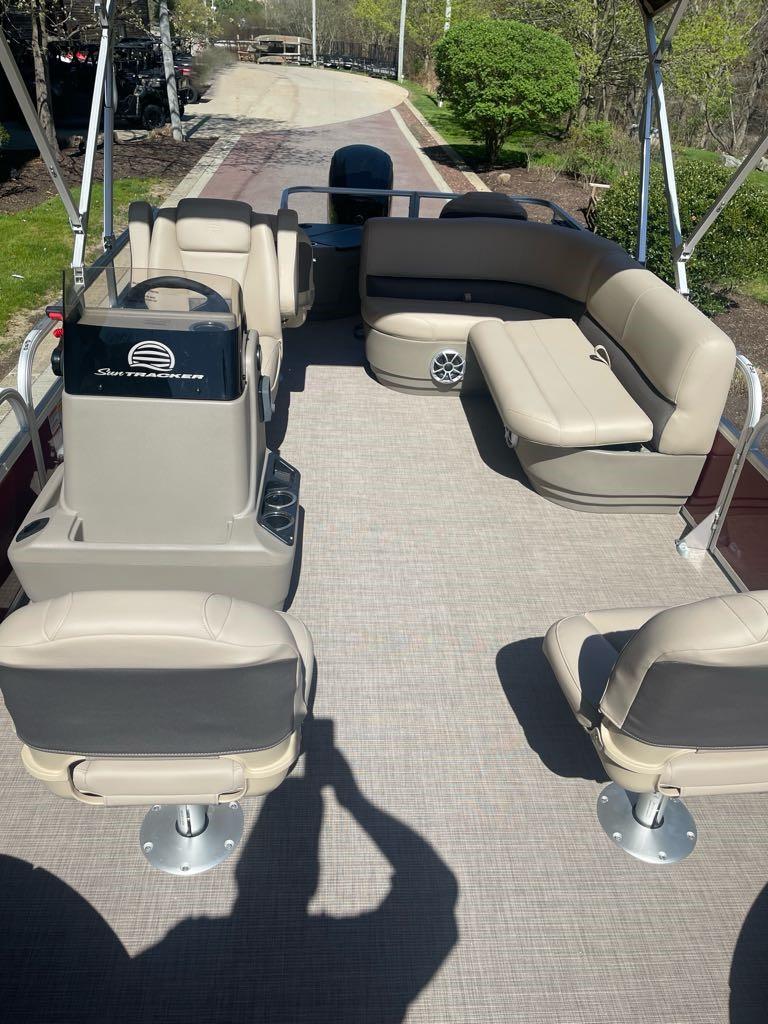 • 9' (2.74 m) SUN TRACKER® QuickLift™ Bimini top w/LED courtesy lights, storage pockets & protective boot (color-coordinated Sand w/Copper Red or Indigo Blue fencing)