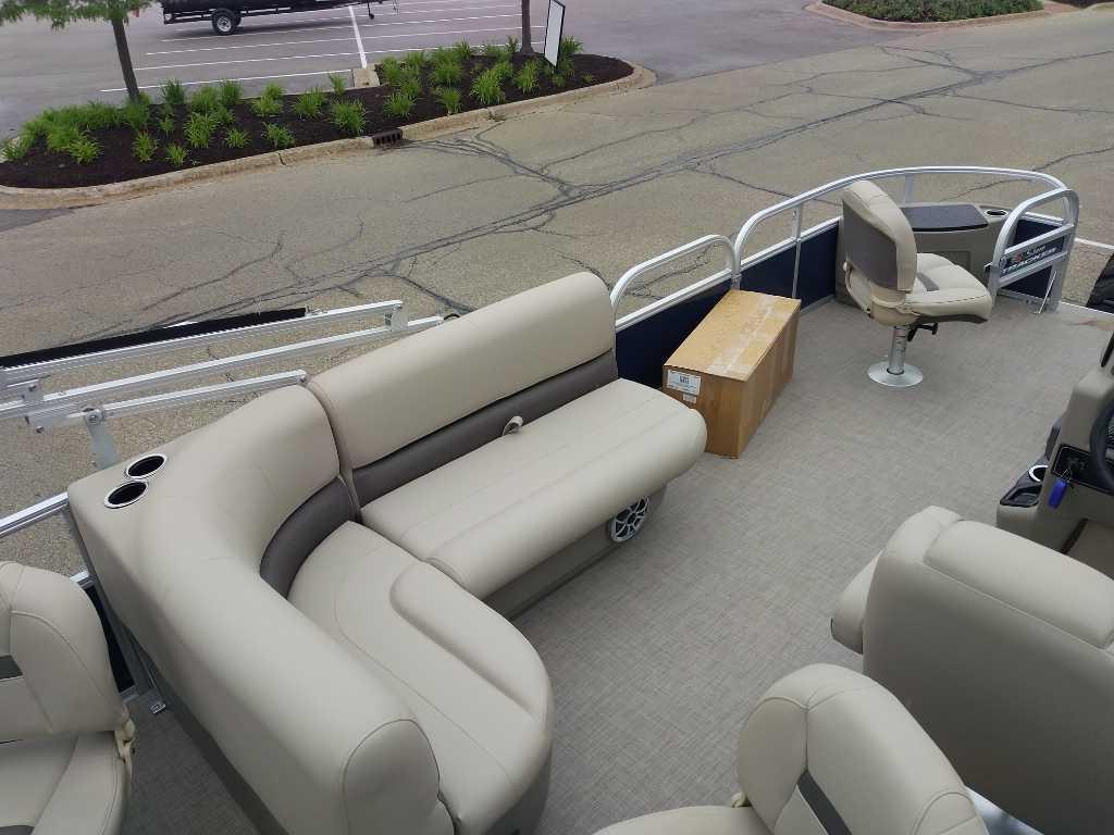 • 9' (2.74 m) SUN TRACKER® QuickLift™ Bimini top w/LED courtesy lights, storage pockets & protective boot (color-coordinated Sand w/Copper Red or Indigo Blue fencing)