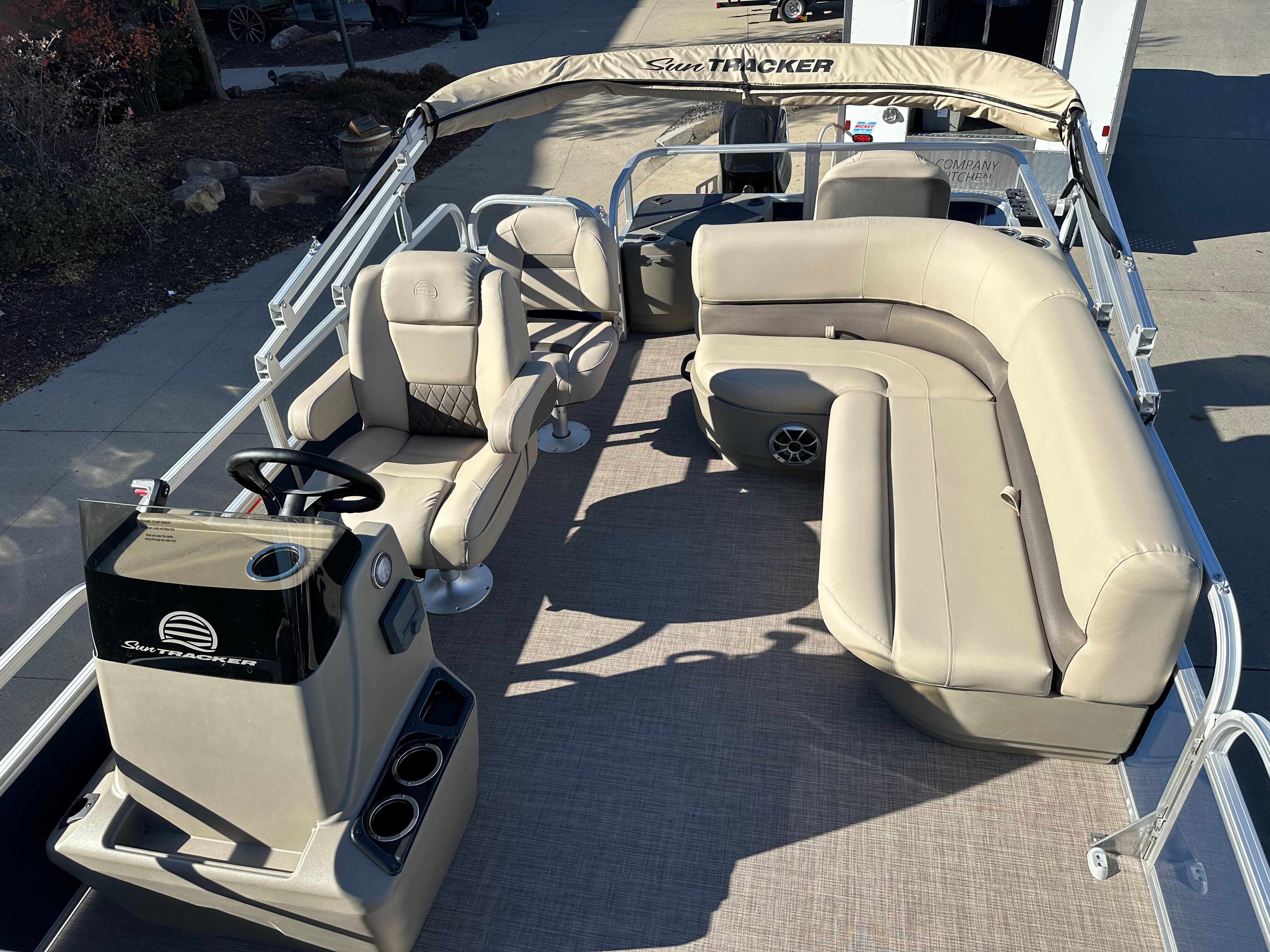 • 9' (2.74 m) SUN TRACKER® QuickLift™ Bimini top w/LED courtesy lights, storage pockets & protective boot (color-coordinated Sand w/Copper Red or Indigo Blue fencing)