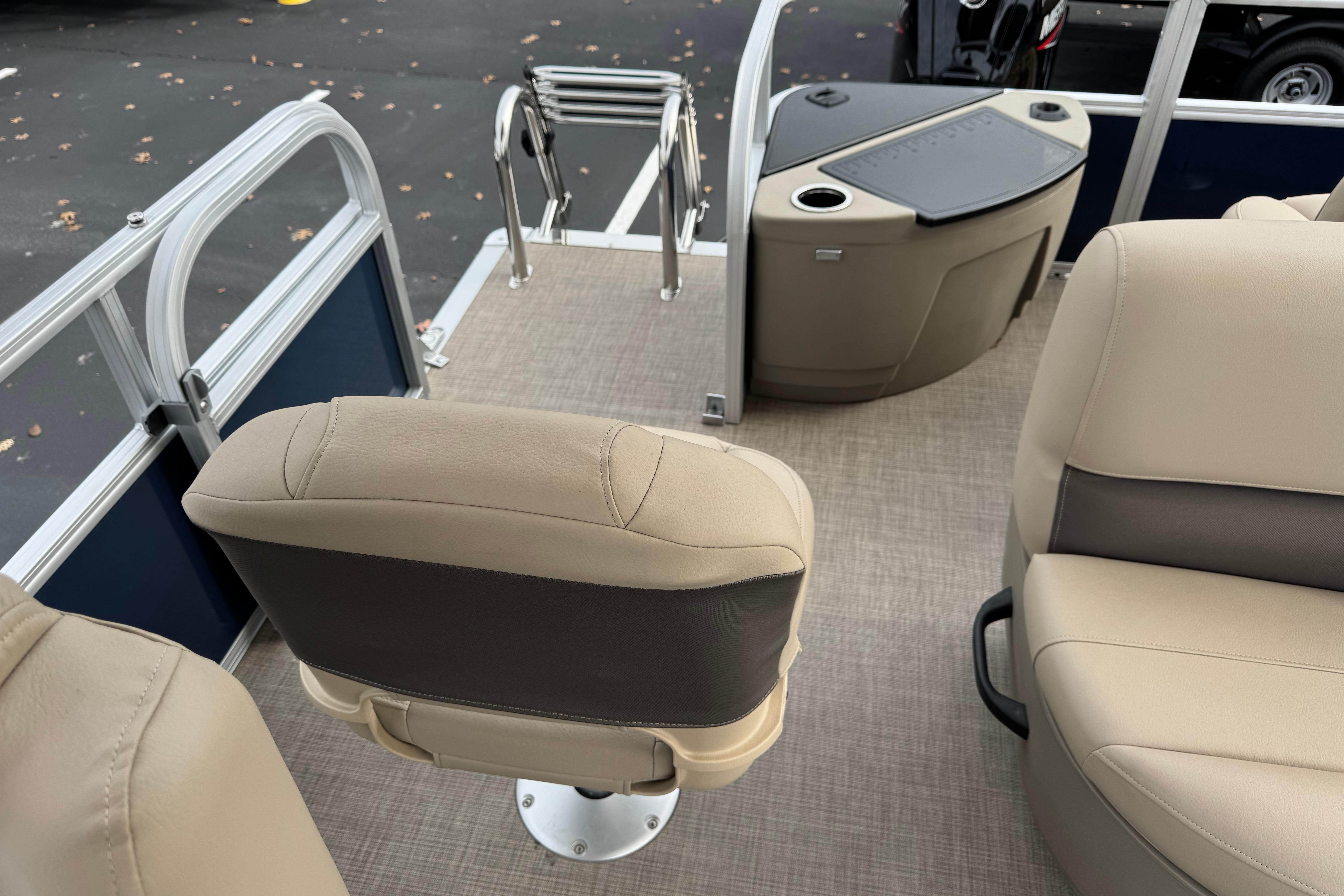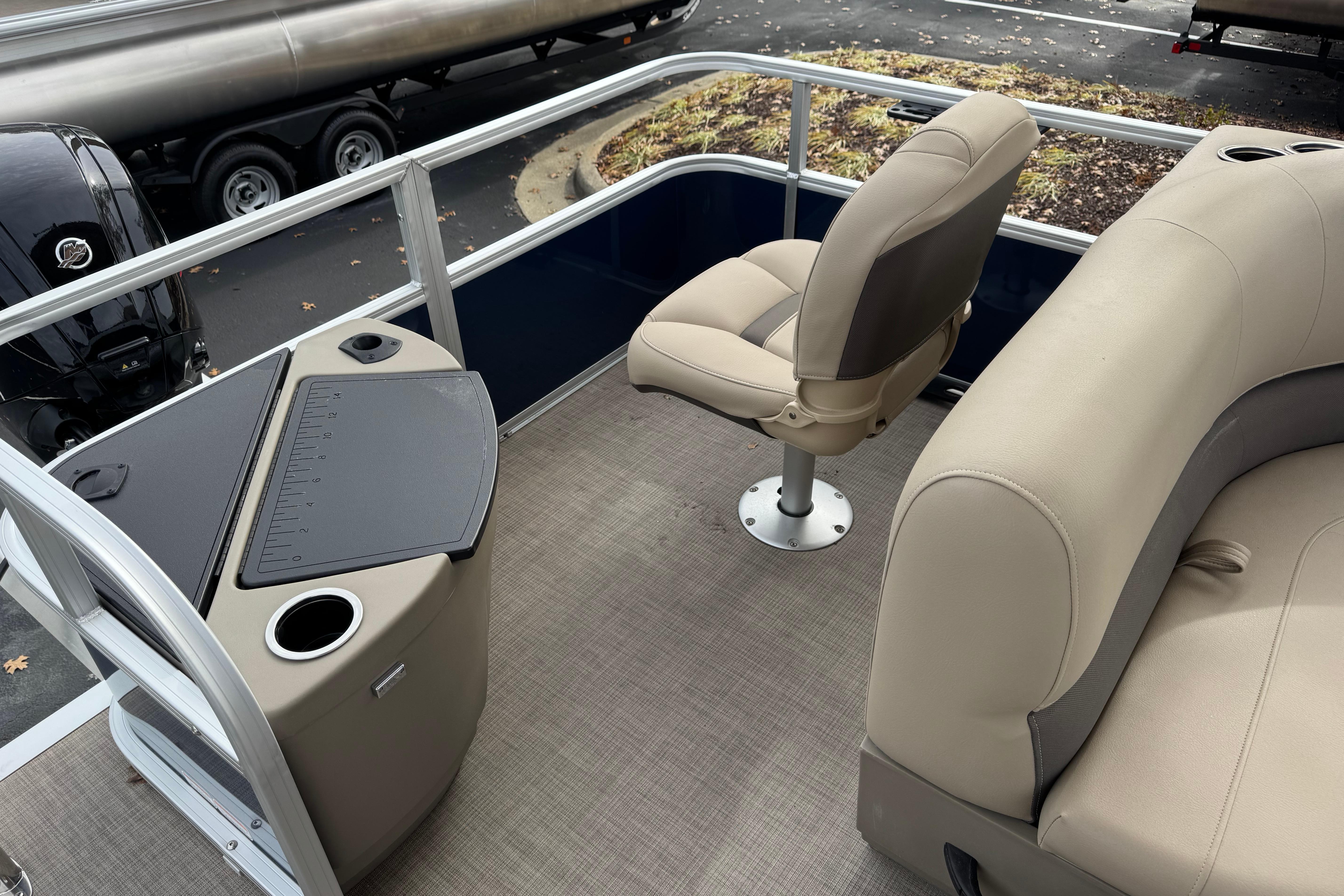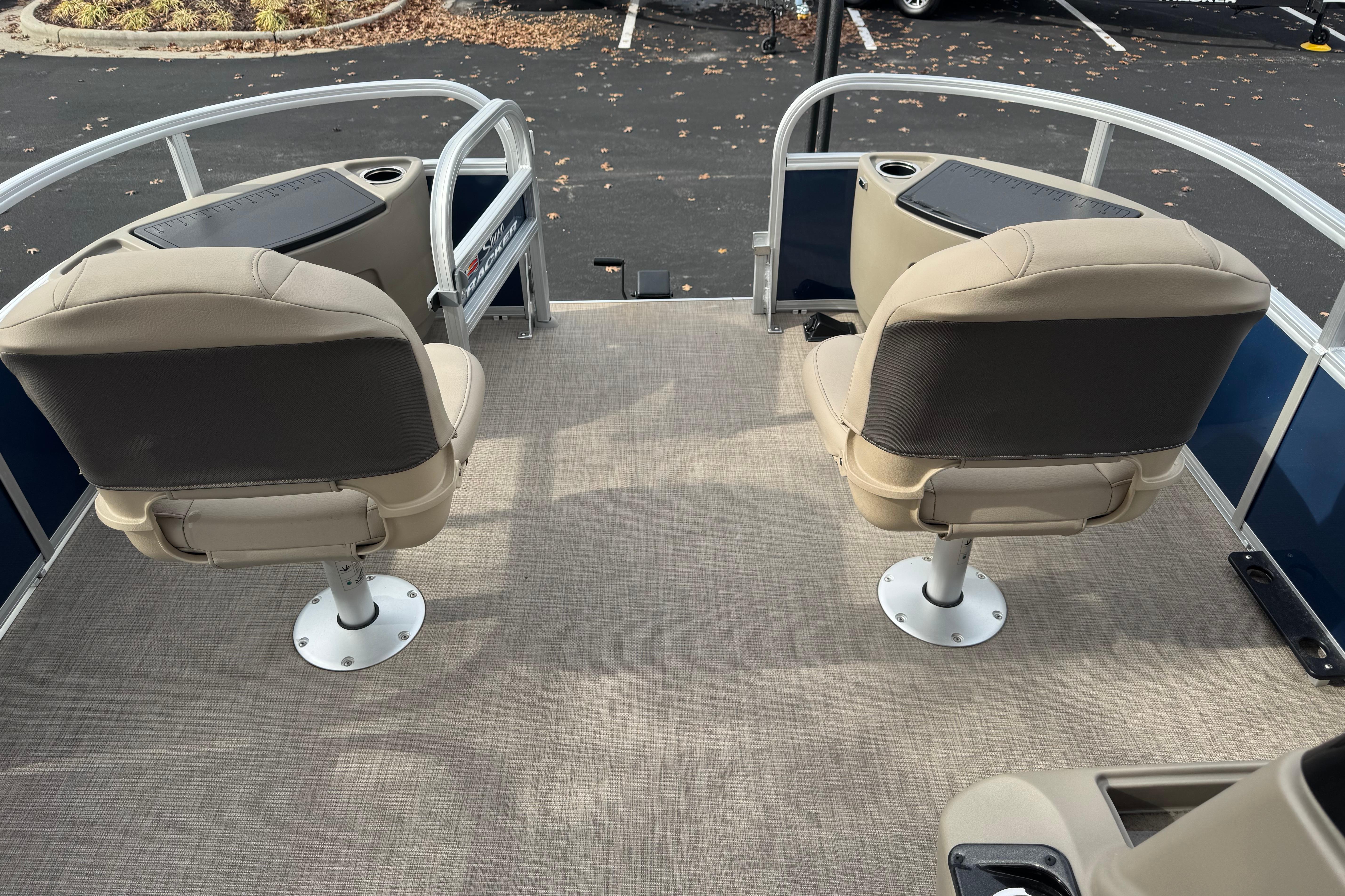 • Front fishing station w/2 pedestal seat bases; rail-mounted rod & tool holders; & bow starboard storage compartment w/rod & drink holders