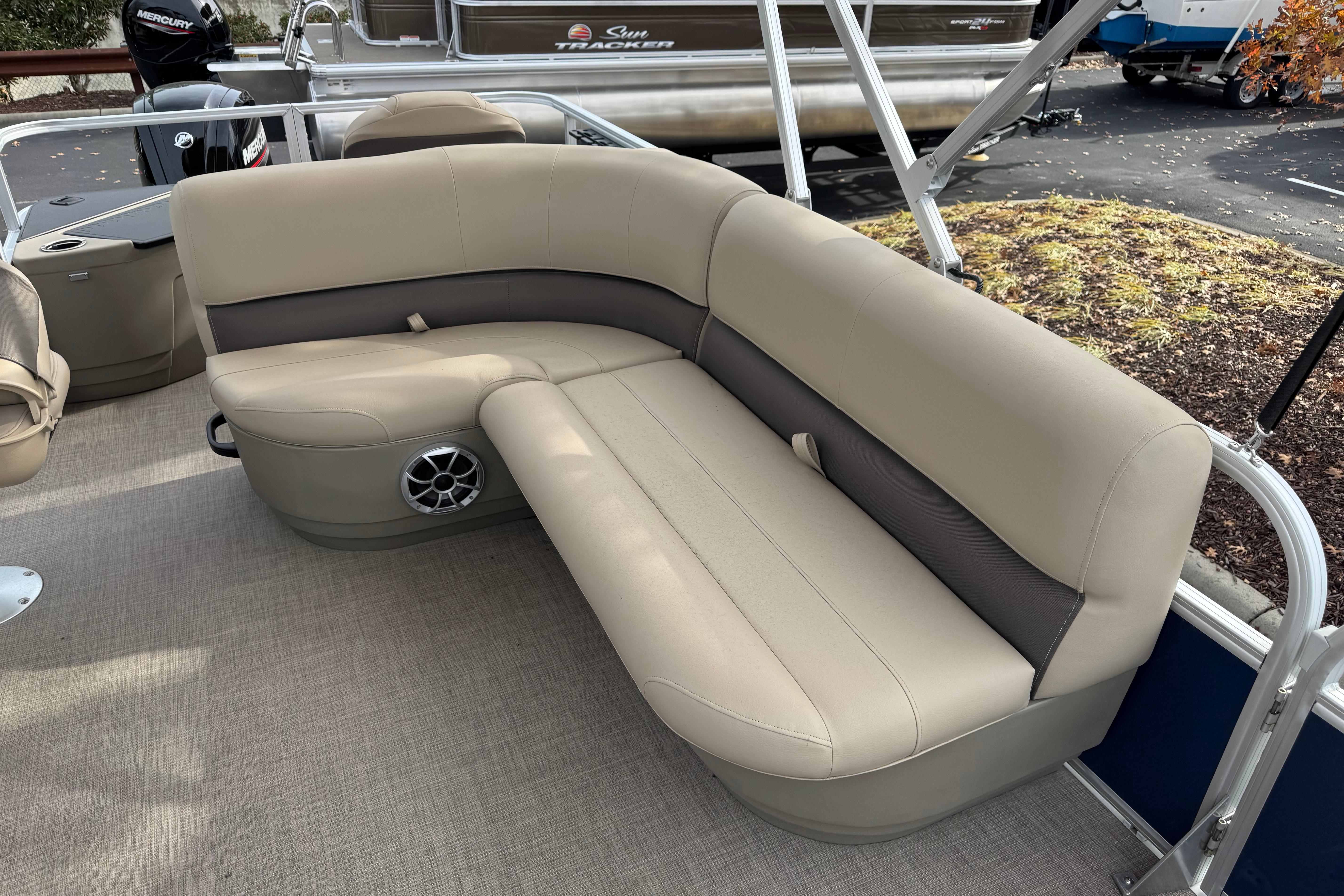 • 9' (2.74 m) SUN TRACKER® QuickLift™ Bimini top w/LED courtesy lights, storage pockets & protective boot (color-coordinated Sand w/Copper Red or Indigo Blue fencing)