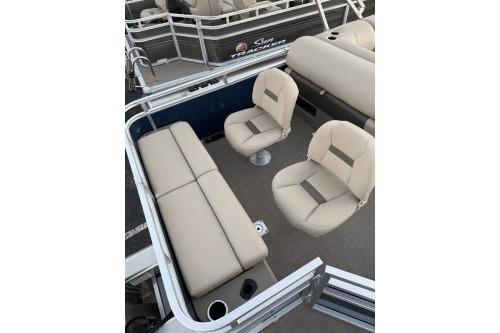 The 2025 FISHIN' BARGE® 22 DLX has a lot to offer to crews as large as 11 people who are looking to get some fishing done or just have some fun on the water! Anglers will never want to leave this fishing pontoon boat's deck. And with fore and aft fishing decks featuring 32 gal. of capacity between 2 livewells, 4 removable and foldable fishing chairs, and a 10' QuickLift® bimini top to stay cool under, there's no reason to leave! But if you have to, the lockable rod compartment lets you rest easy until your next fishing trip.