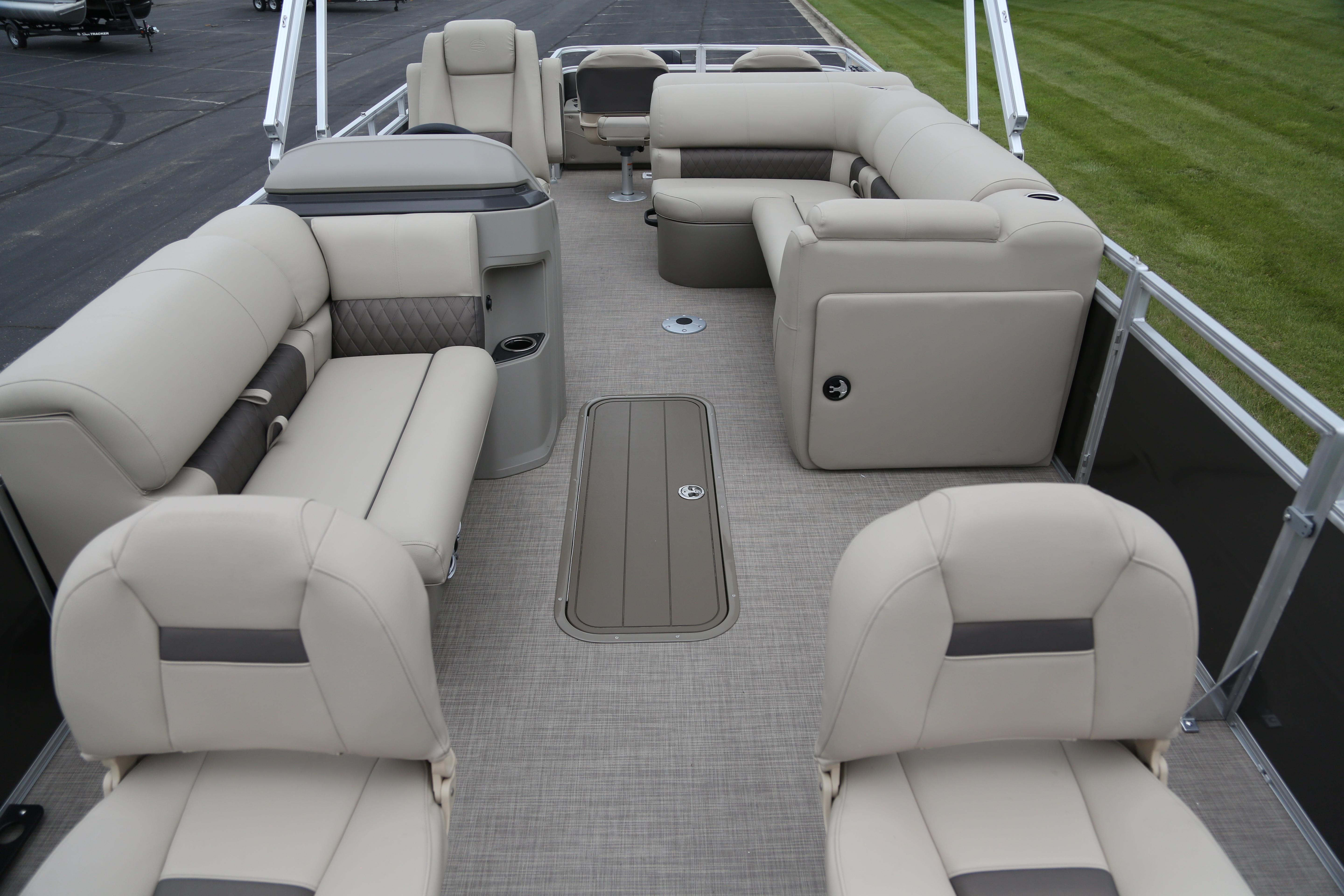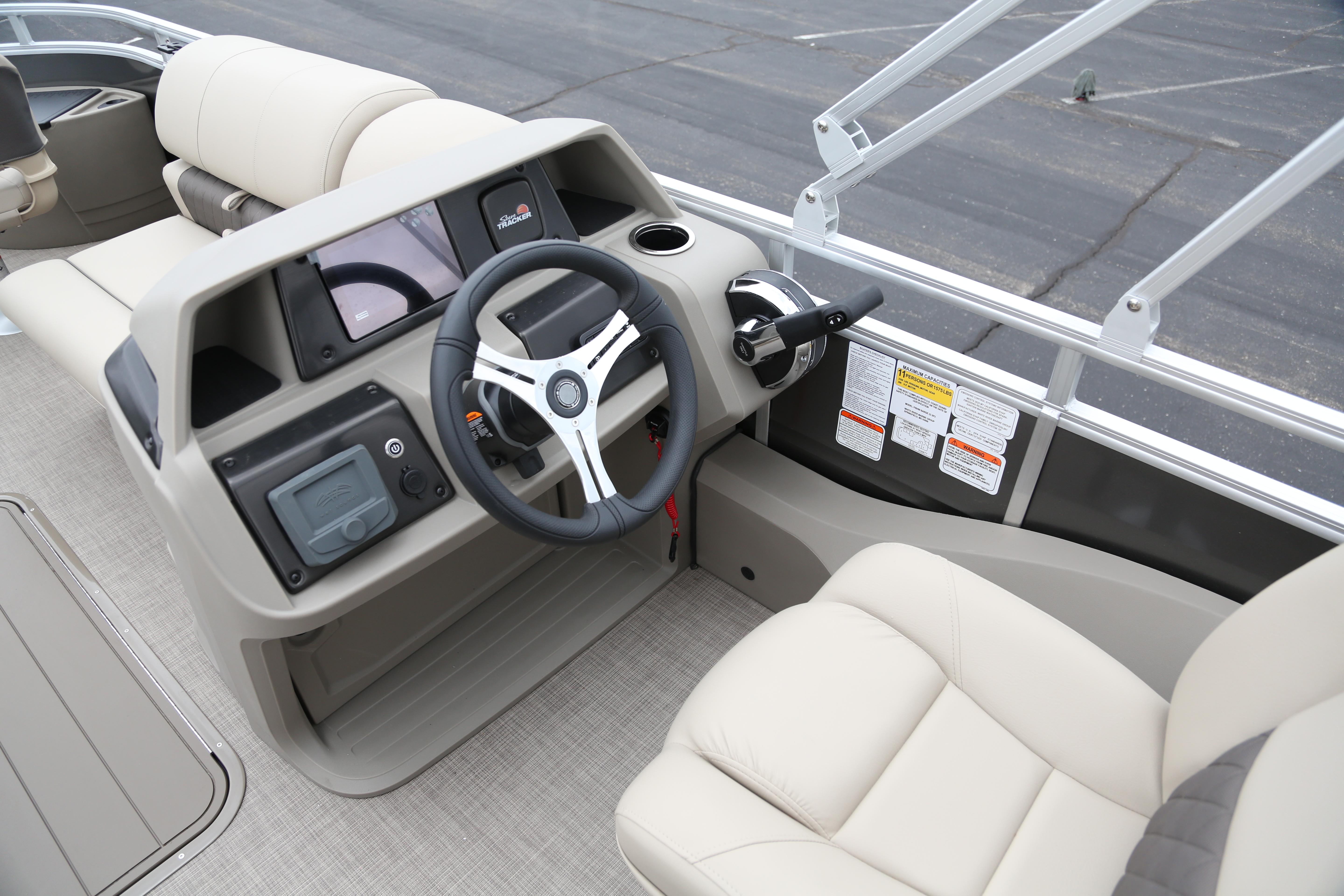 • 10' (3.05 m) SUN TRACKER® QuickLift™ Bimini top w/LED courtesy lights, storage pockets & protective boot (color-coordinated Black w/Charcoal fencing or Sand w/Indigo Blue fencing)