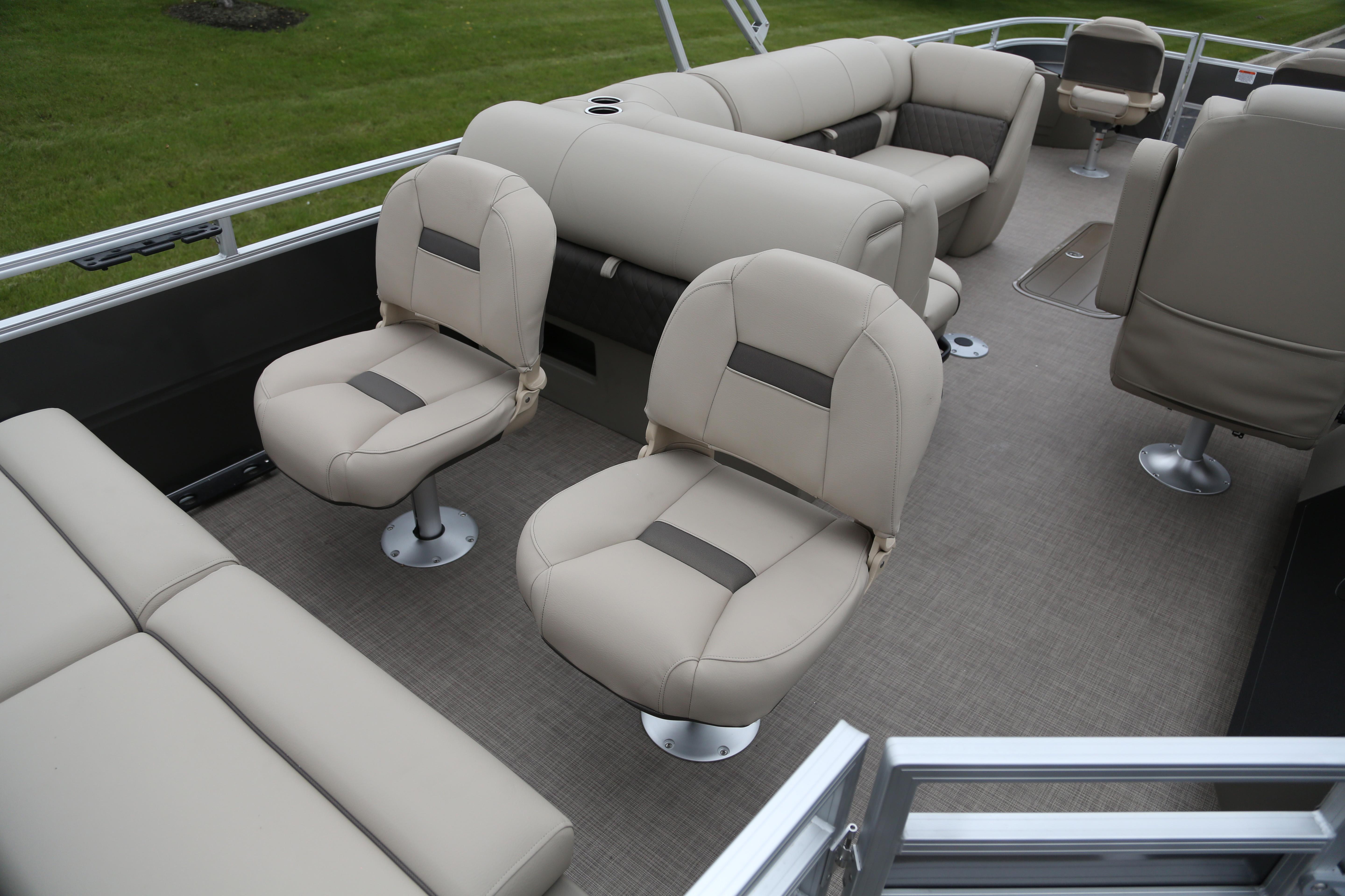 • Aft fishing station w/2 pedestal seat bases; rail-mounted rod & tool holders; STOW MORE™ tackle storage station; & rear-facing tackle storage