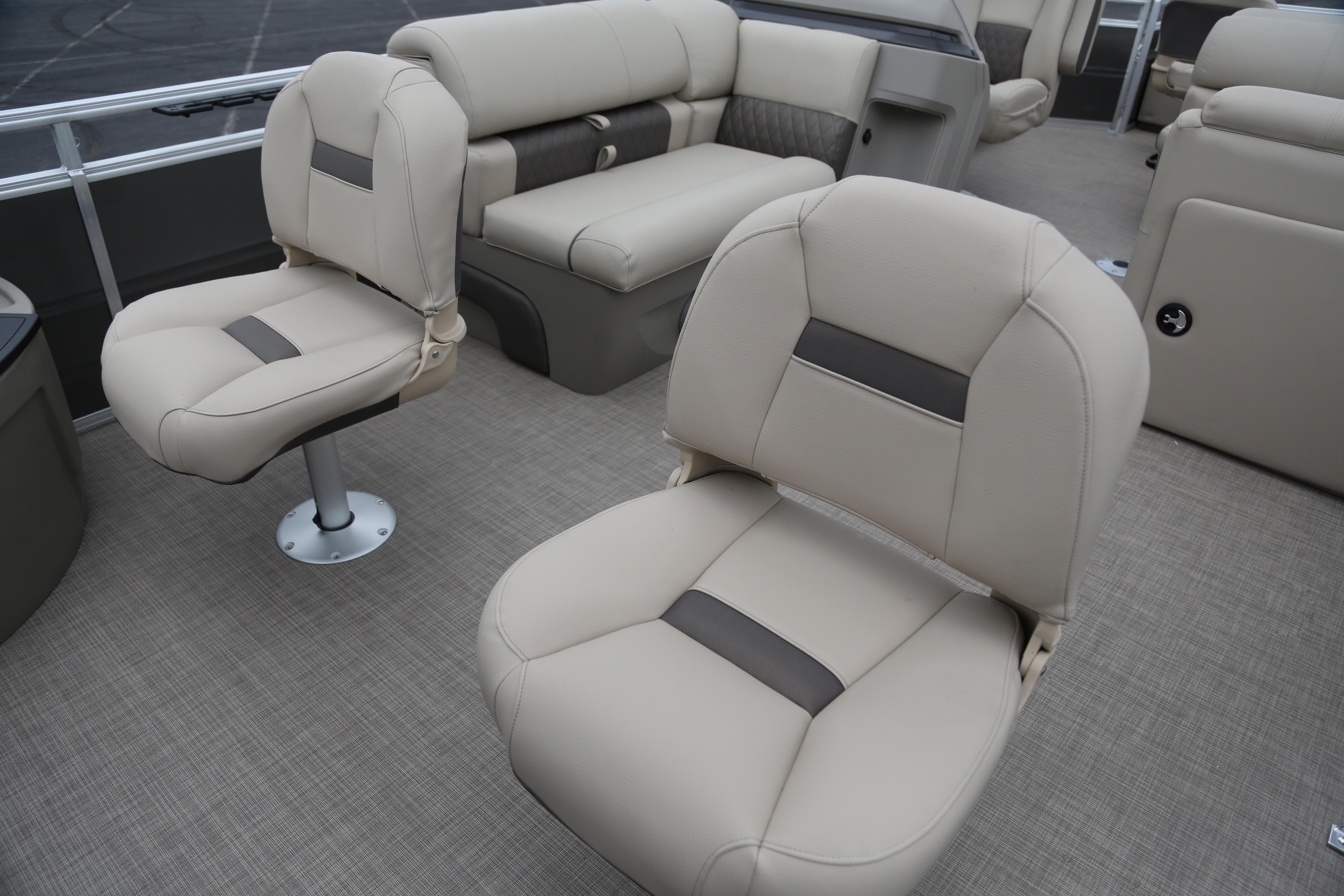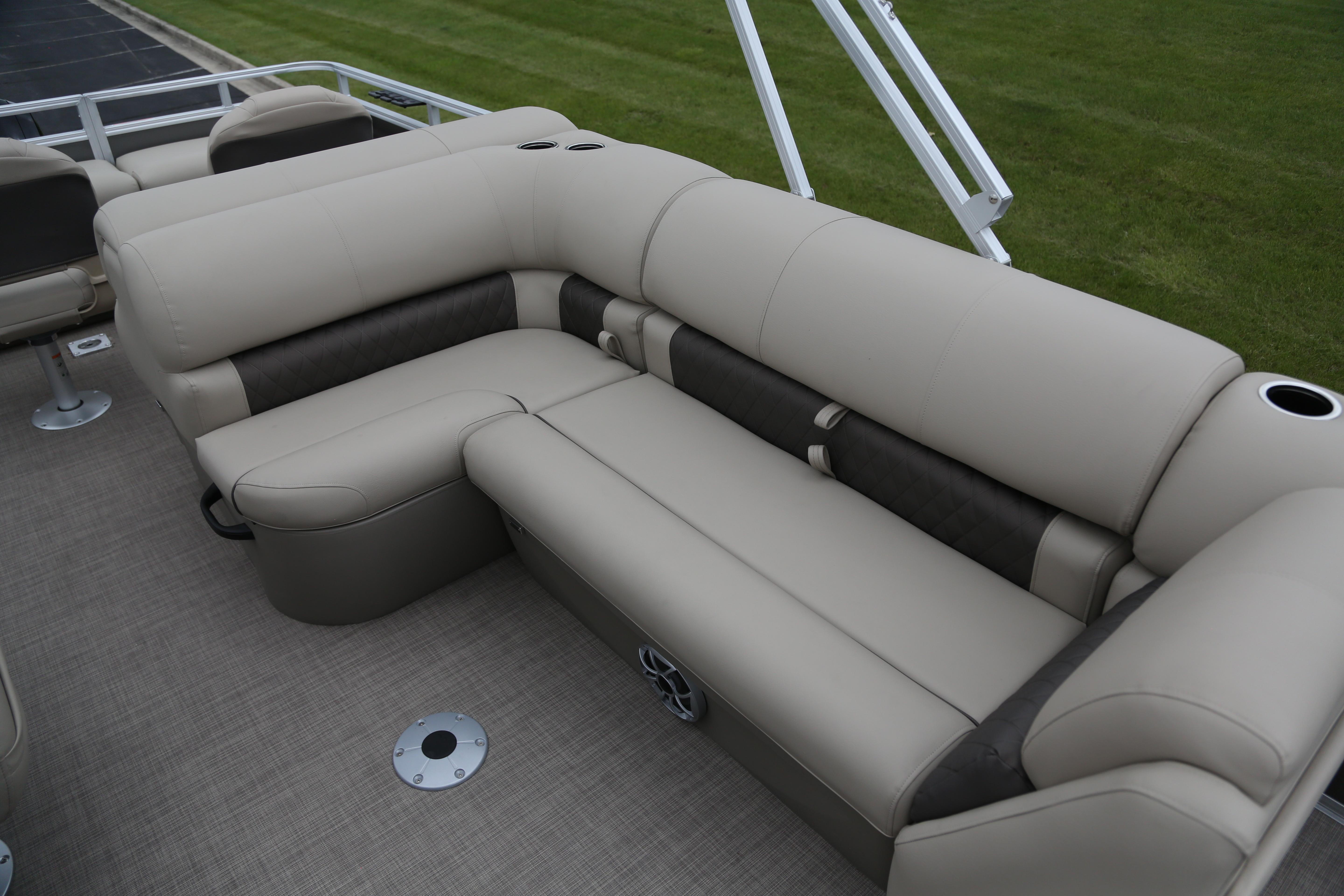 When the rods are down, relax in the L-shaped port lounge or the starboard couch. At the helm, you'll find a swiveling captain's chair and a console with a storage space, drink holders, and ergonomically positioned controls. That's where you'll also find the Wet Sounds® stereo with Bluetooth® compatibility that plays through 2 upholstery speakers. Other features to get excited about include the 10' QuickLift® bimini top and the STOW MORE™ system that hides storage spaces in the seats.