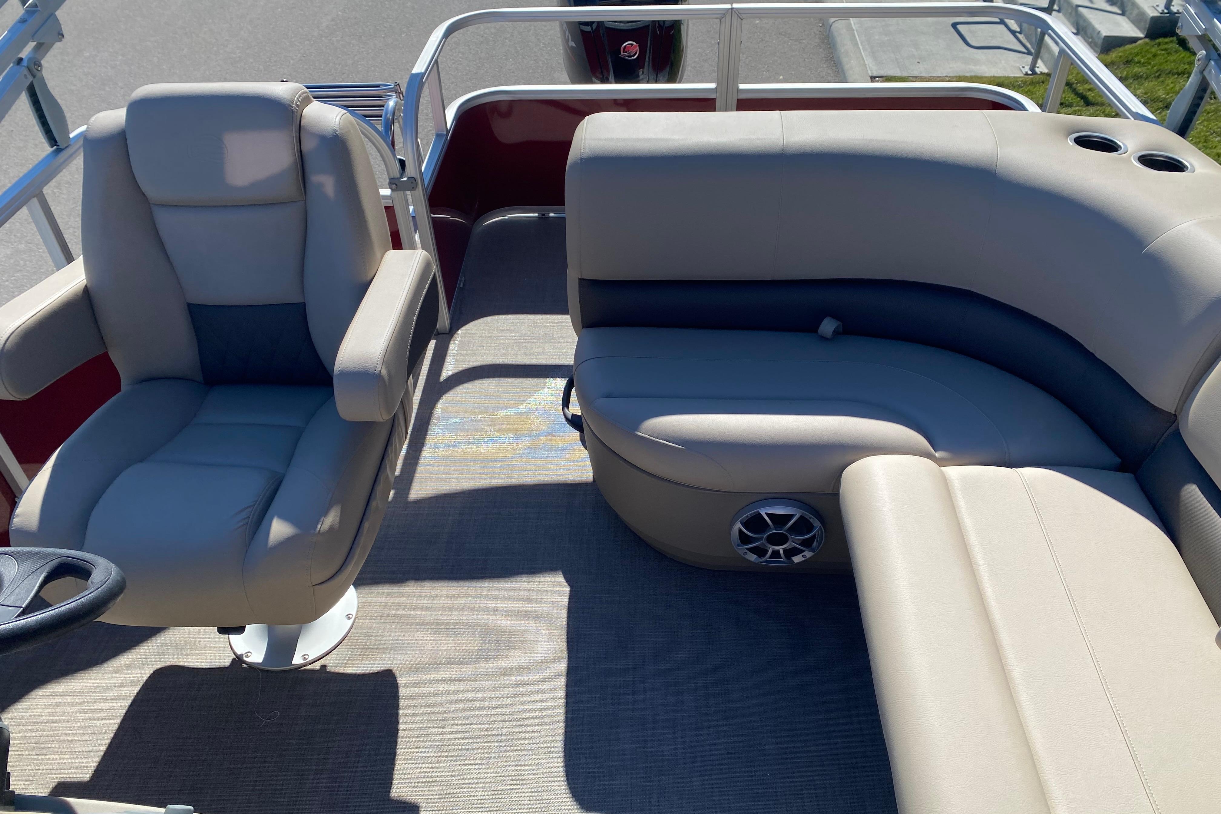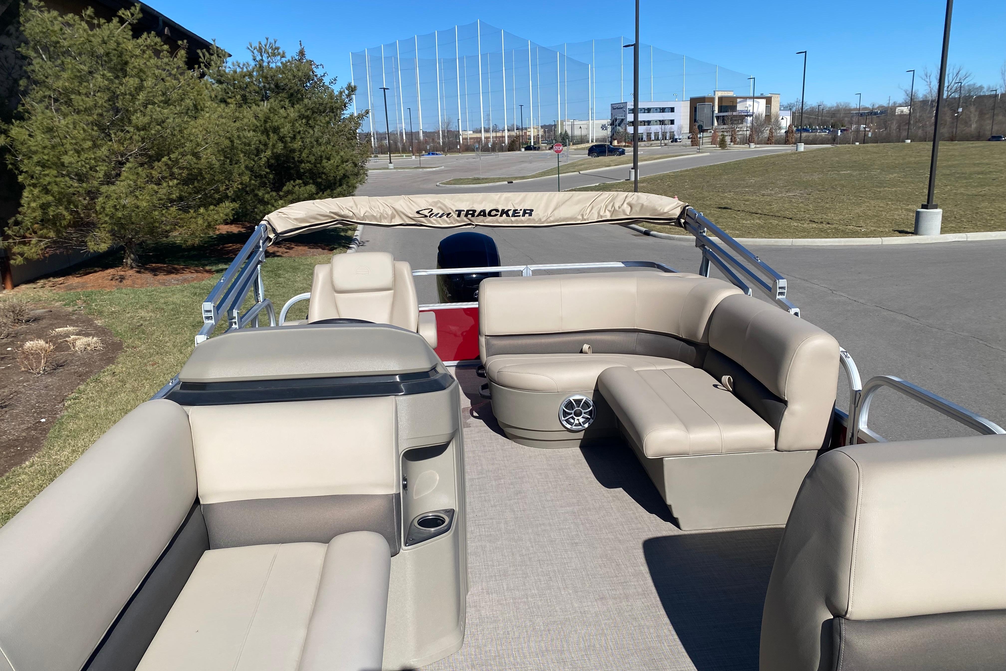 • 9' (2.74 m) Bimini top w/LED courtesy lights, storage pockets, protective boot & accepts optional drop-down changing curtain (color-coordinated Black w/Charcoal fencing or Sand w/Copper Red fencing)