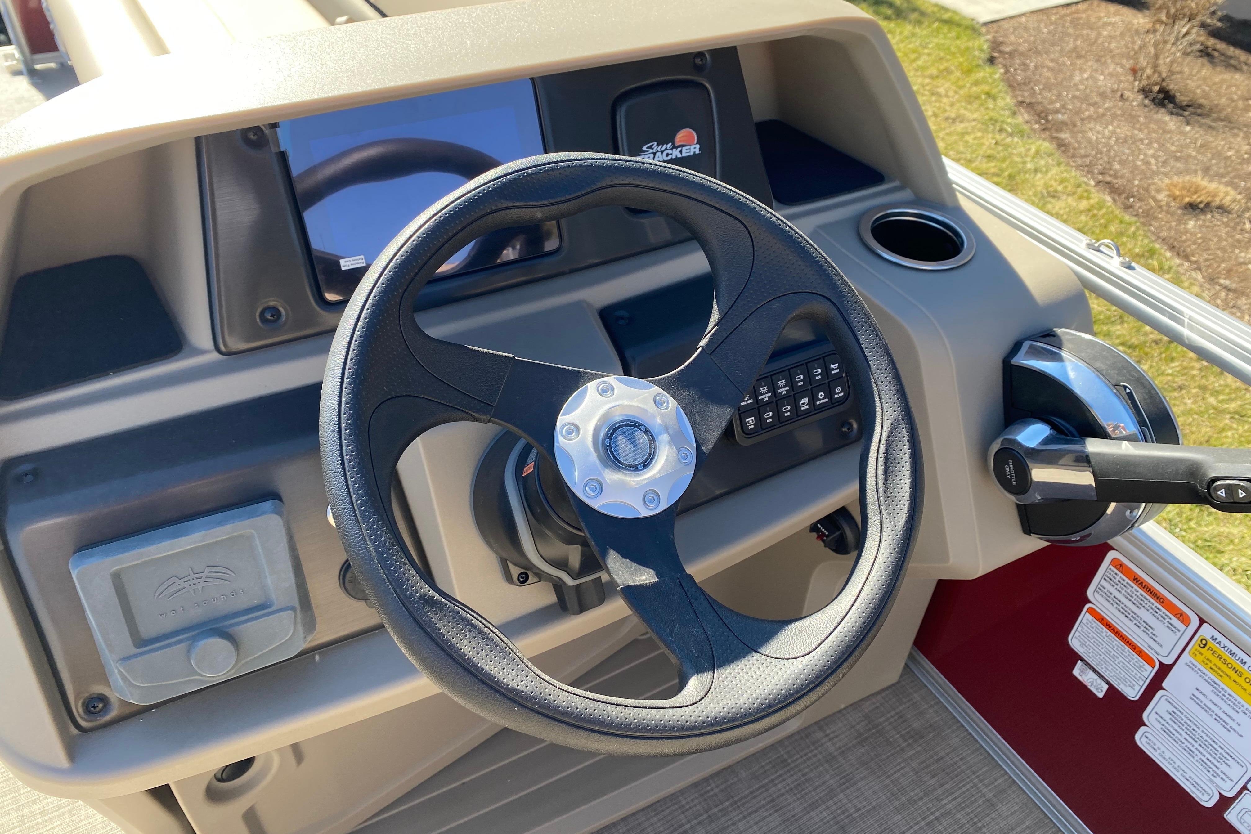 When the sun is high, raise the 9' bimini top for some shade. Create the ideal soundtrack for your adventure with the standard Wet Sounds® stereo and 2 upholstery speakers. The SUN TRACKER FLARE touch-screen gauge display and 12-button switch panel give you ultimate control over your boating experience.