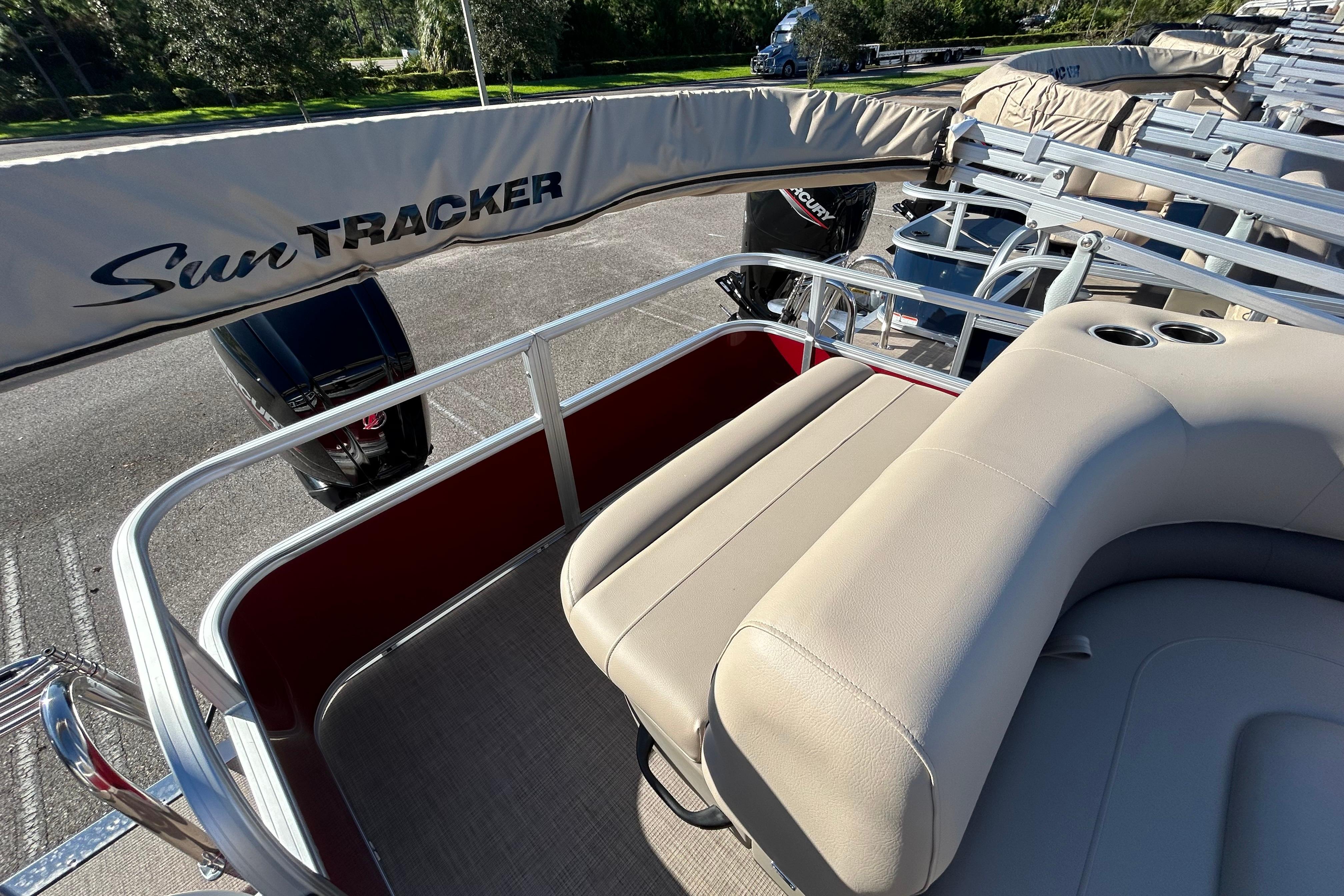 • 9' (2.74 m) Bimini top w/LED courtesy lights, storage pockets, protective boot & accepts optional drop-down changing curtain (color-coordinated Black w/Charcoal fencing or Sand w/Copper Red fencing)